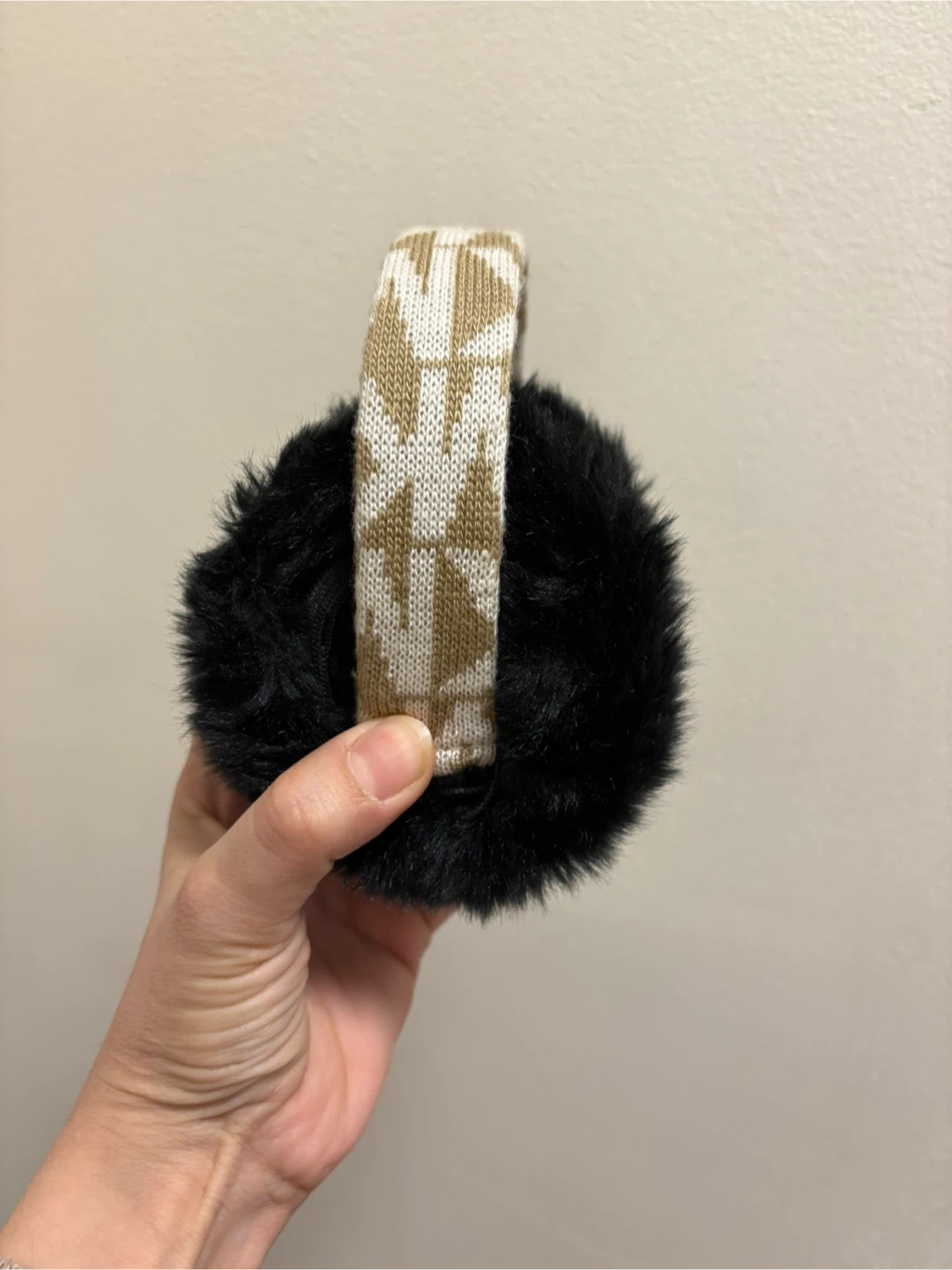Michael Kors earmuffs in black with the MK logo pattern on the headband. It's made with soft, fuzzy material for warmth. Keeps your ears cozy on chilly days!