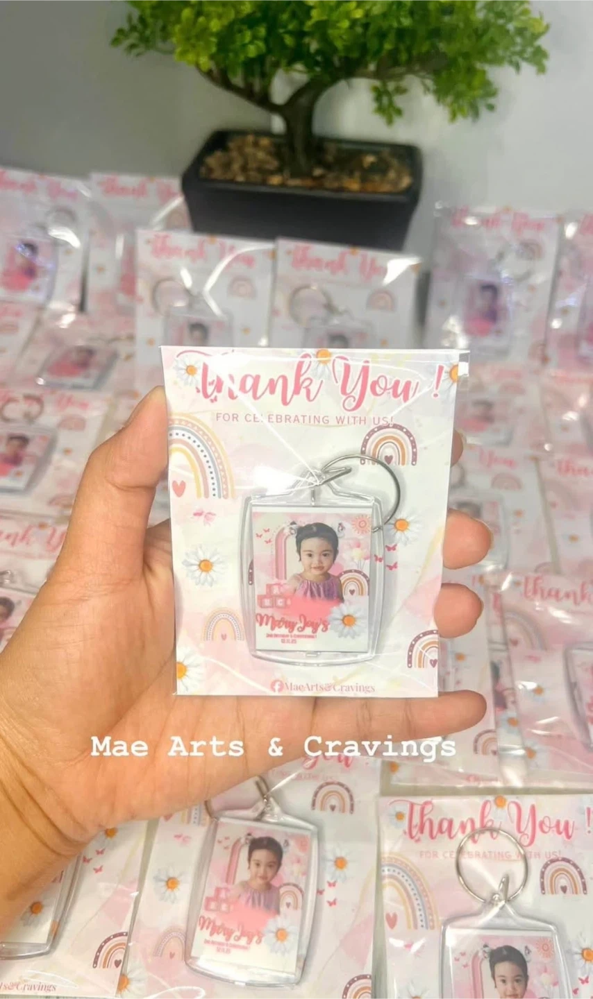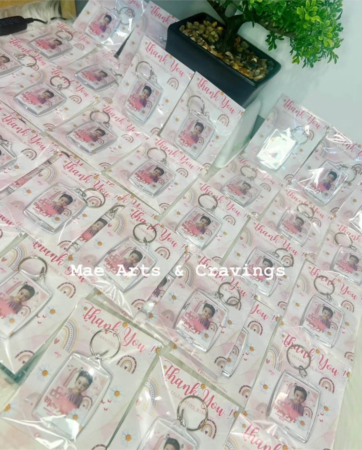Personalized keychains perfect for thank you gifts at celebrations. Each keychain can be customized with a photo and name, making them a unique memento. They're great party favours for birthdays or any special event!