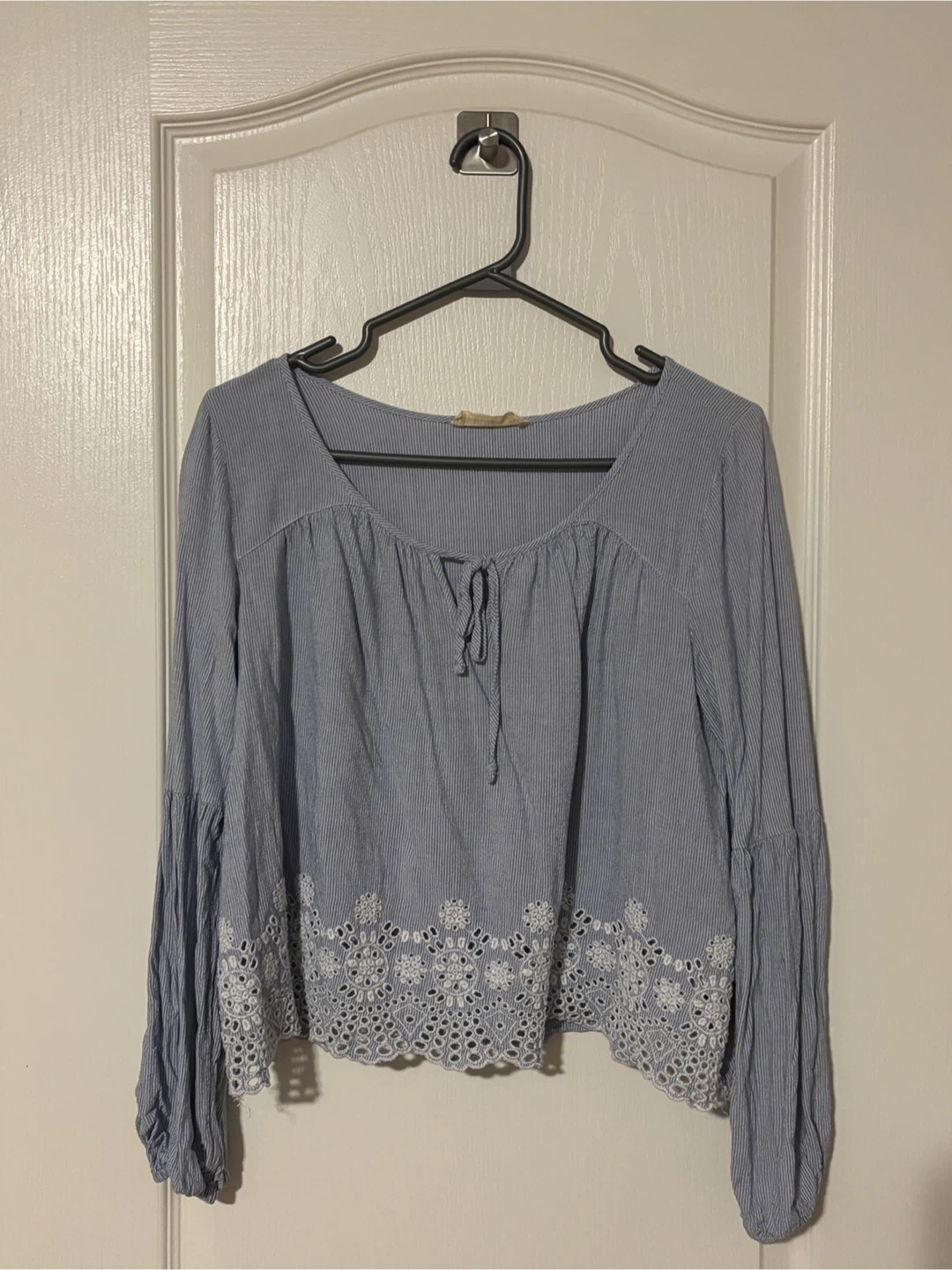 Here's a cute Hollister blouse that would be a great addition to your wardrobe! It features a lovely blue striped pattern and delicate white lace detailing along the bottom. It's perfect for a casual day out or dressing up for a special occasion