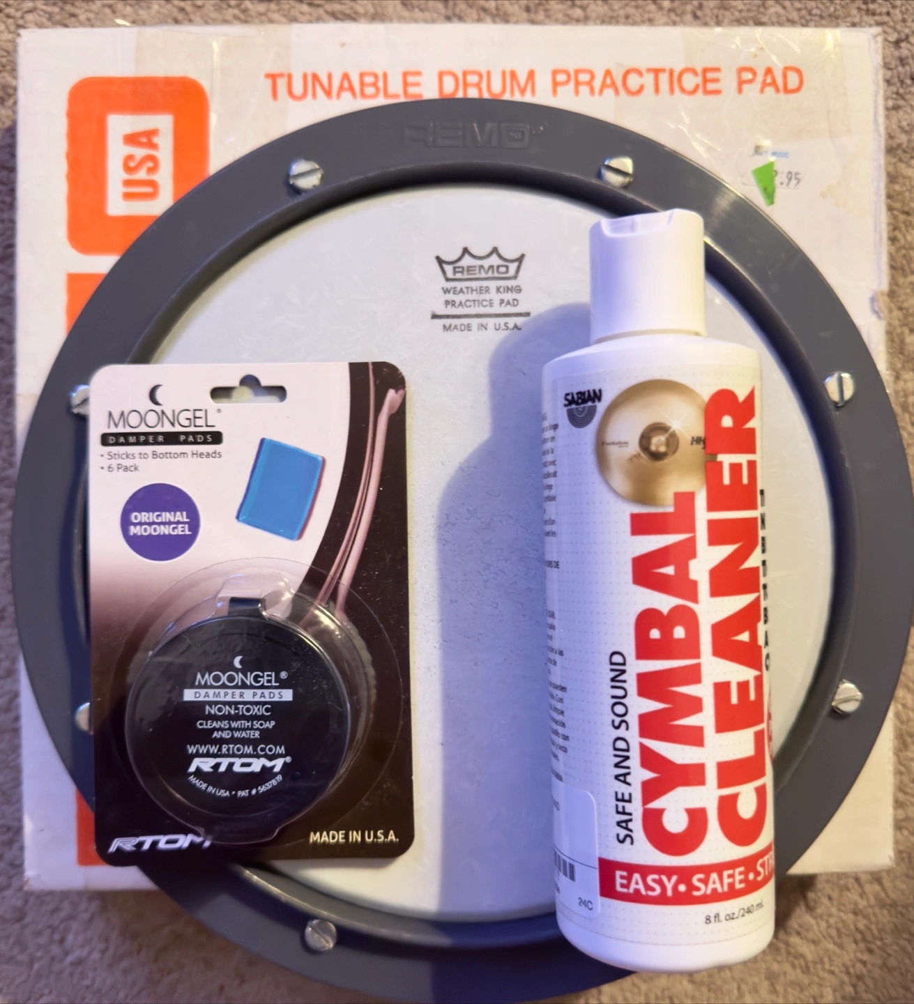 Selling a Remo Tunable Drum Practice Pad. Also included is Sabian Cymbal Cleaner and Moongel Damper Pads. Perfect for drummers looking to practice quietly or maintain their cymbals!