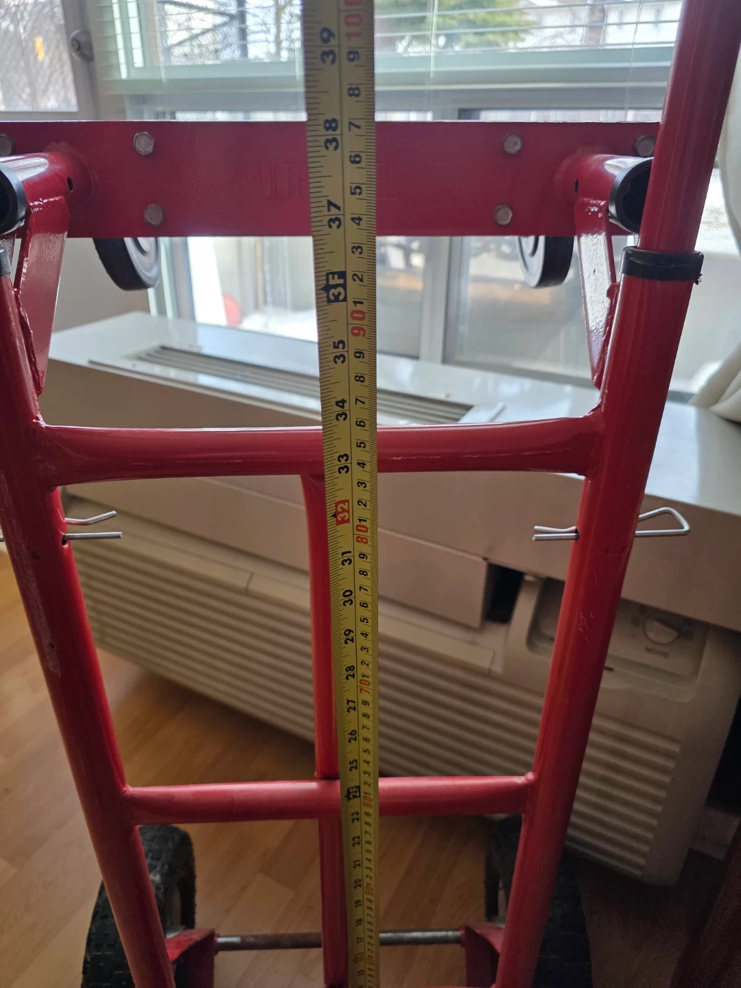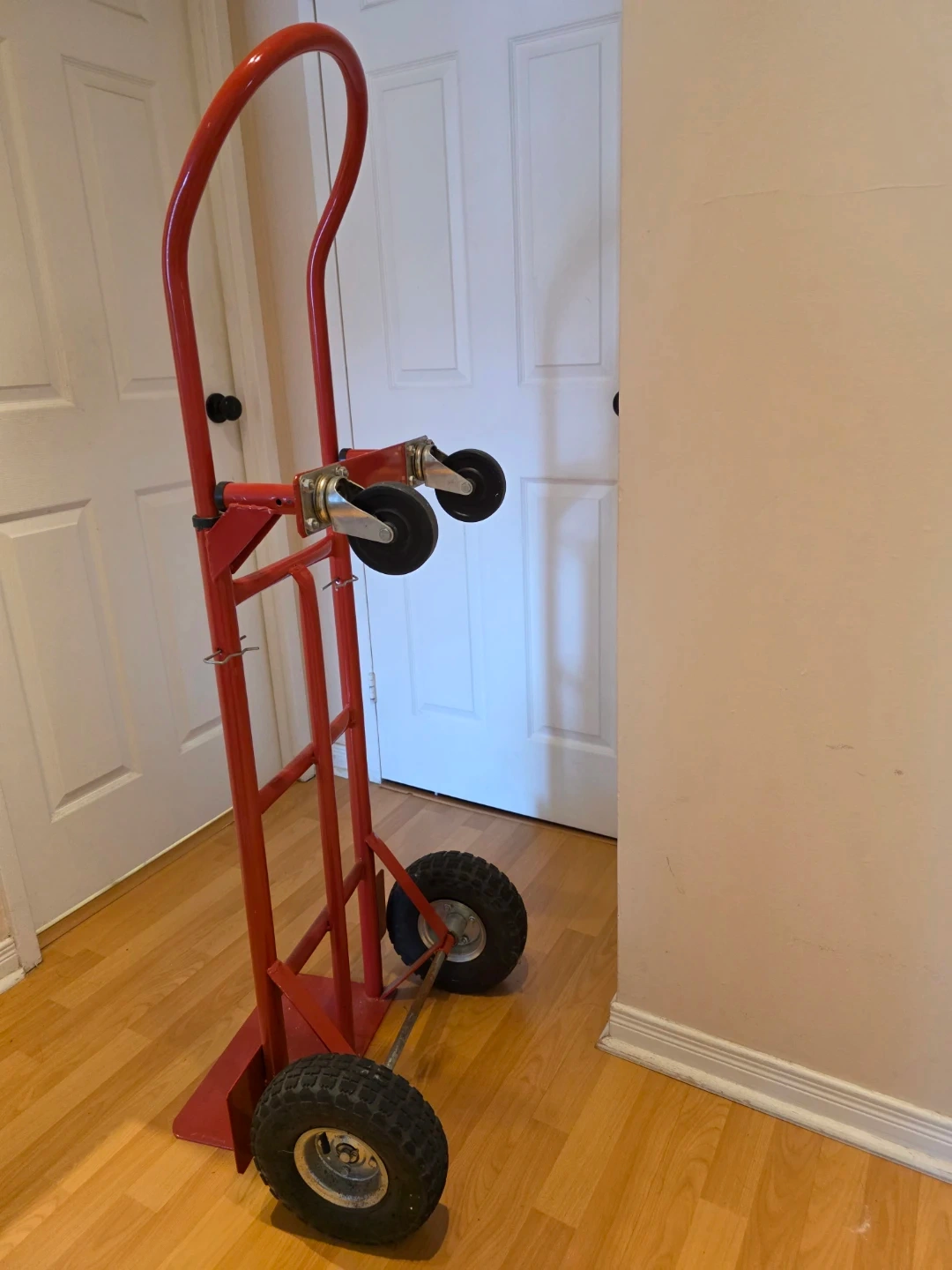 This is a sturdy metal truck dolly. It's designed for moving heavy items. It has two large wheels and small wheels that can be used in a horizontal setup.