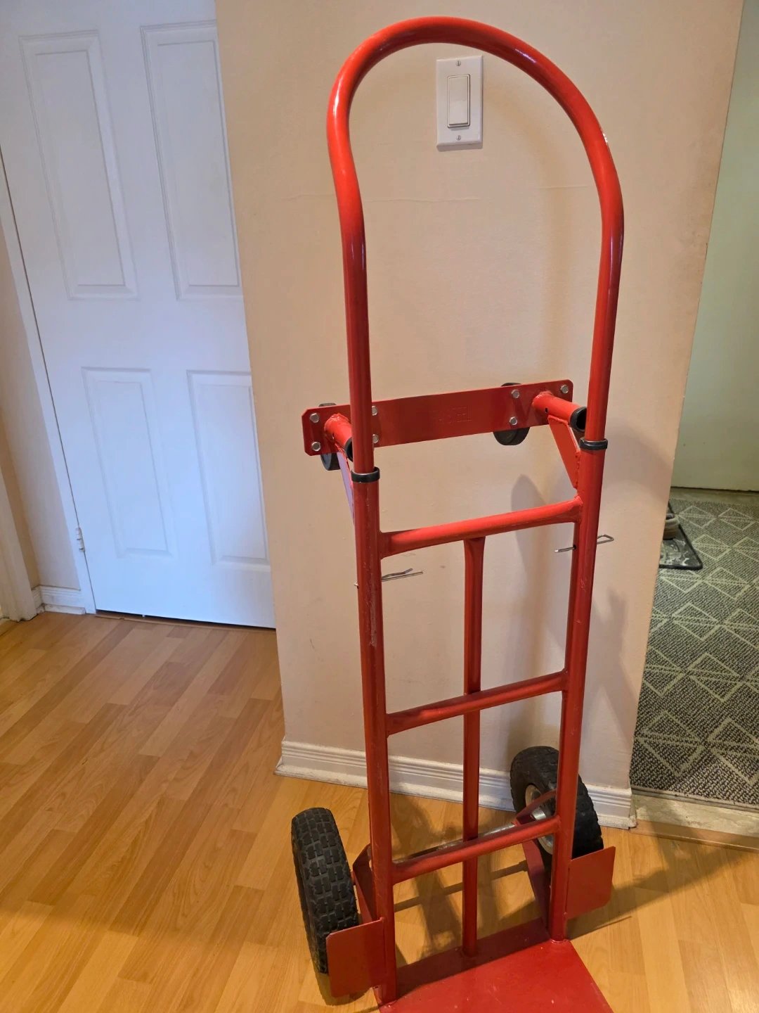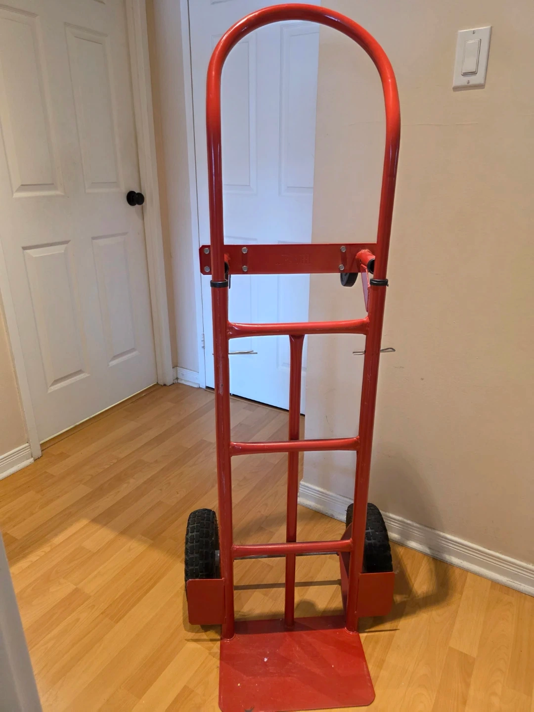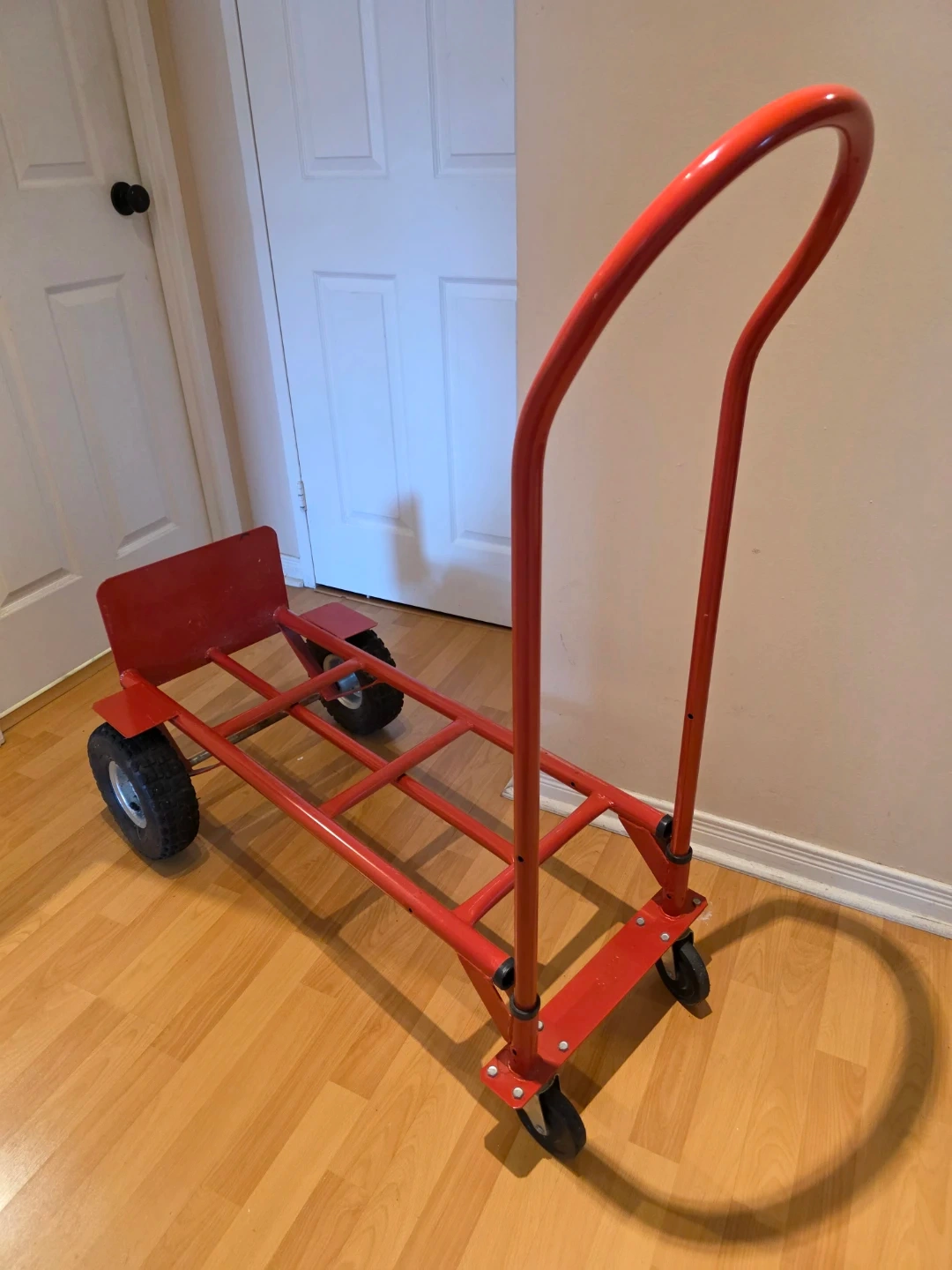 This is a sturdy metal truck dolly. It's designed for moving heavy items. It has two large wheels and small wheels that can be used in a horizontal setup.