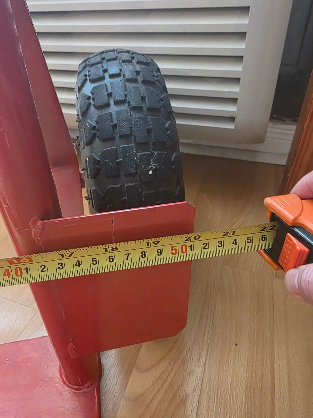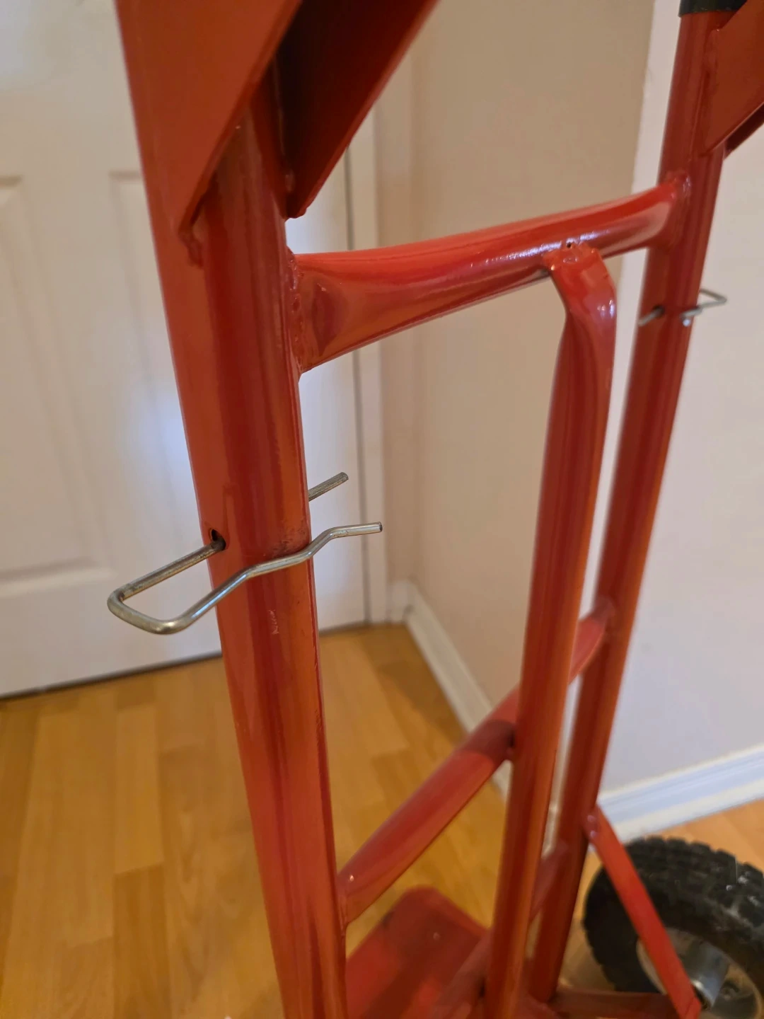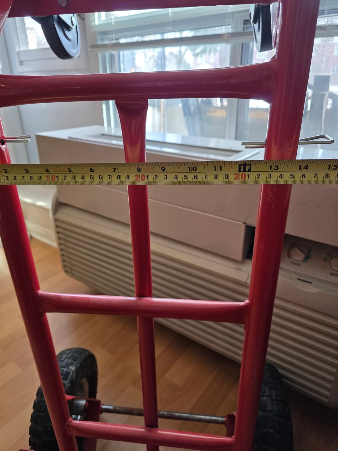 This is a sturdy metal truck dolly. It's designed for moving heavy items. It has two large wheels and small wheels that can be used in a horizontal setup.