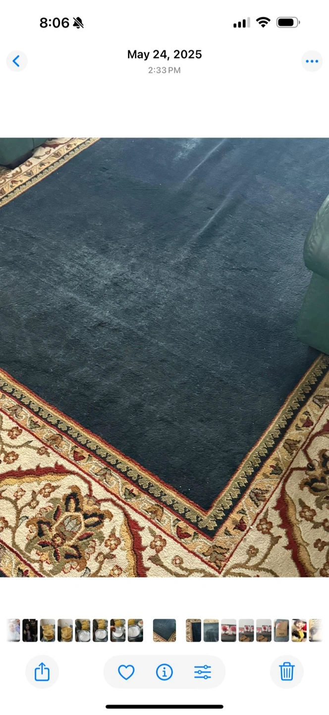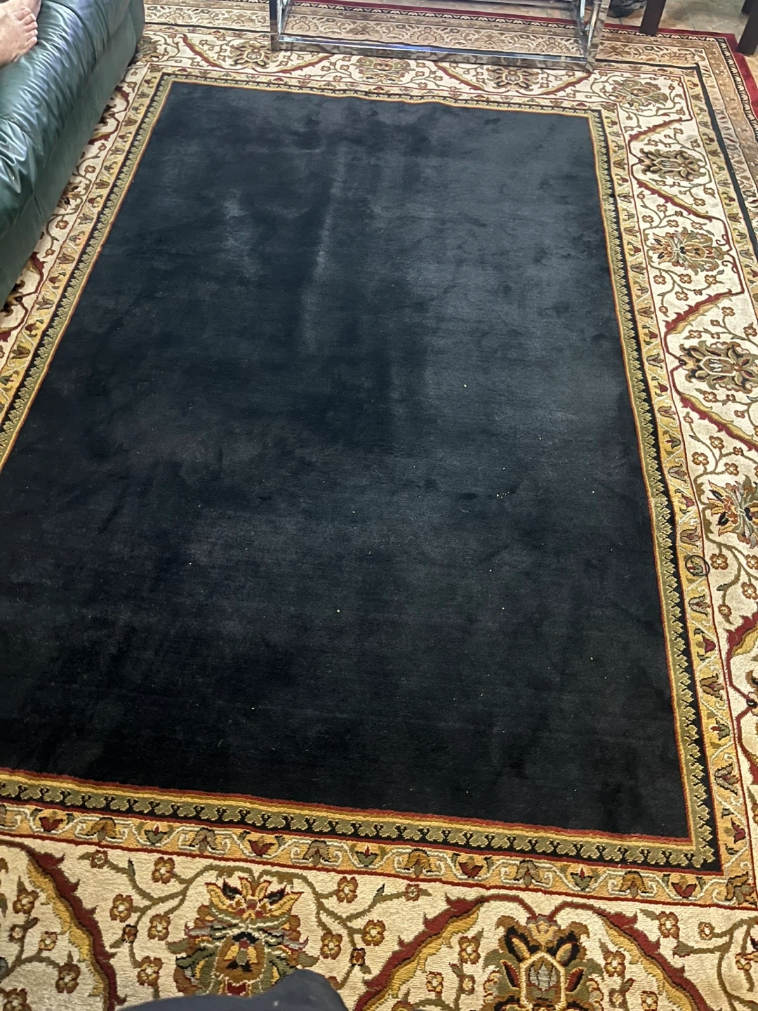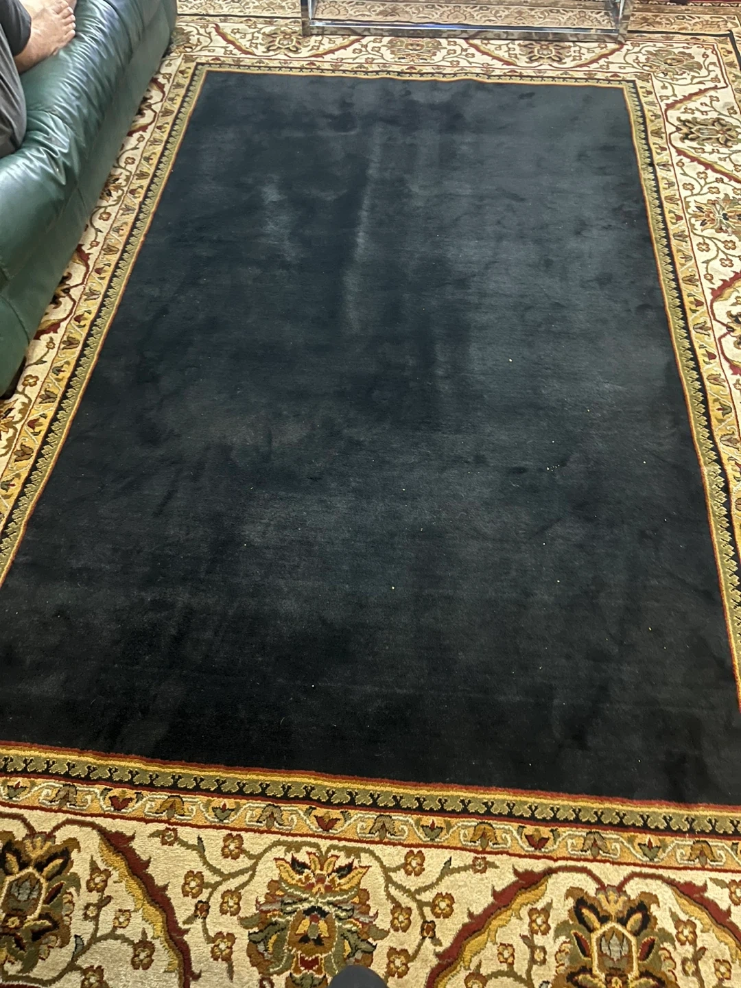 A dark blue area rug featuring a traditional, multi-coloured border. It's a beautiful statement piece for any room! Material is soft and durable.