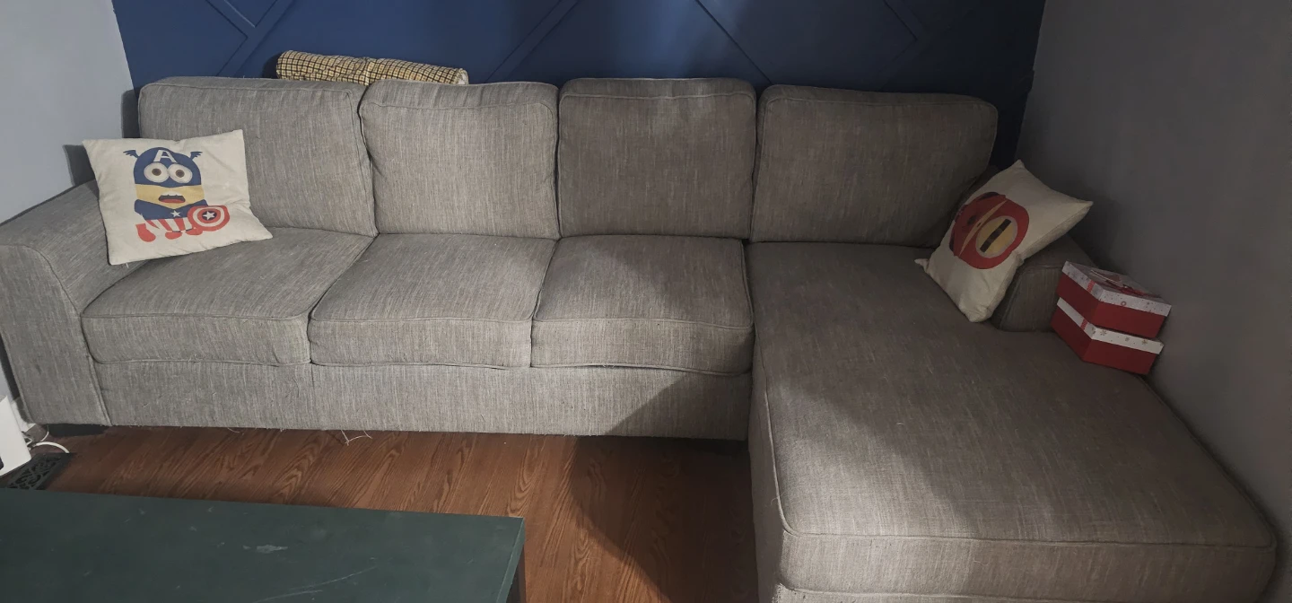 Selling a comfy grey sectional sofa. It's in good condition and ready for a new home! Perfect for a living room or family room.