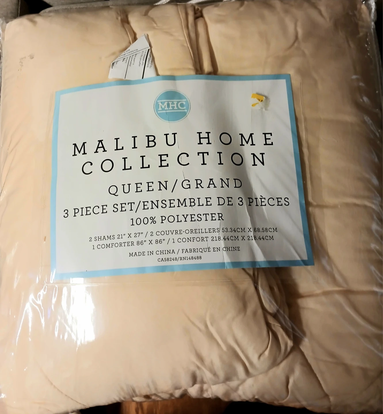 Selling a Malibu Home Collection queen/grand 3-piece set. The set includes two shams (21" x 27") and one comforter (86" x 86"). It's made of 100% polyester and is in great condition!