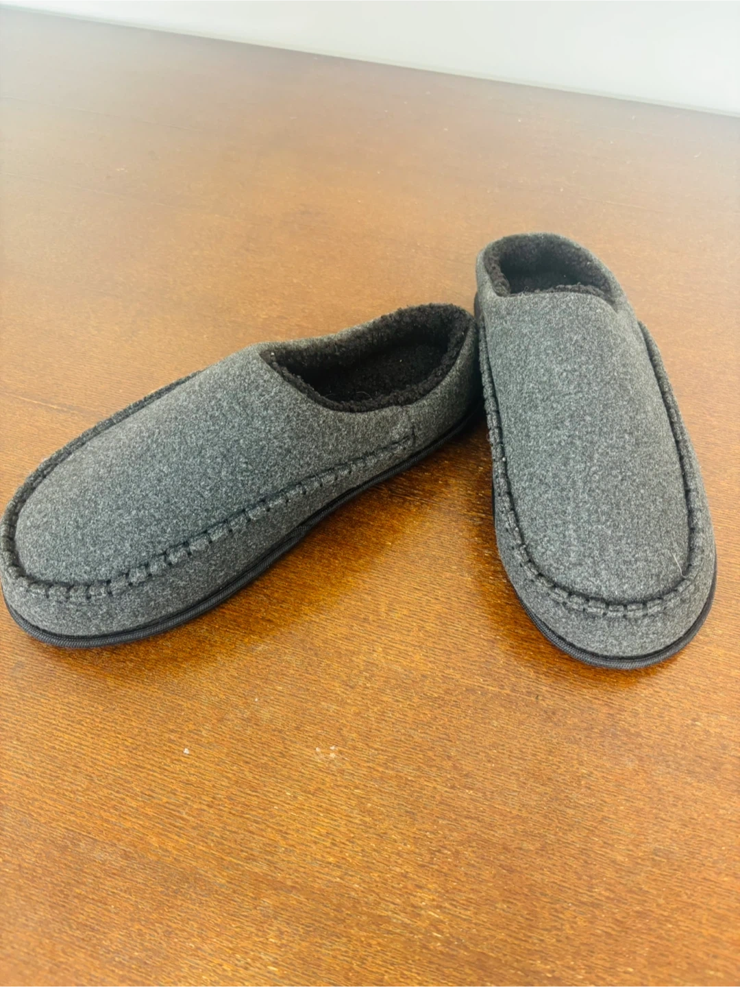 Cozy grey slippers with a soft fleece lining for warmth. They have a durable sole and a comfortable slip-on design. Great for keeping your feet toasty at home! Men’s 11/12, never used.