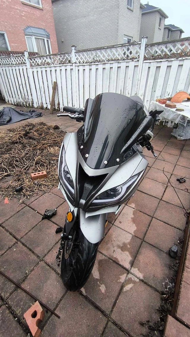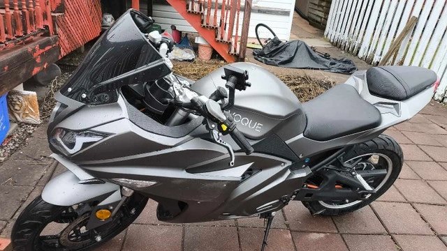 Grey electric motorcycle with 84v 60ah long lasting battery.