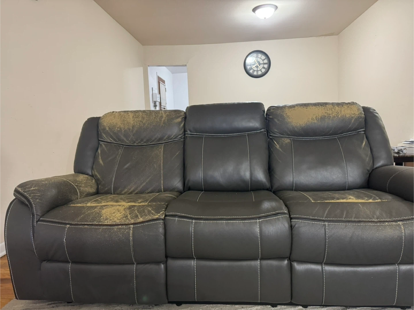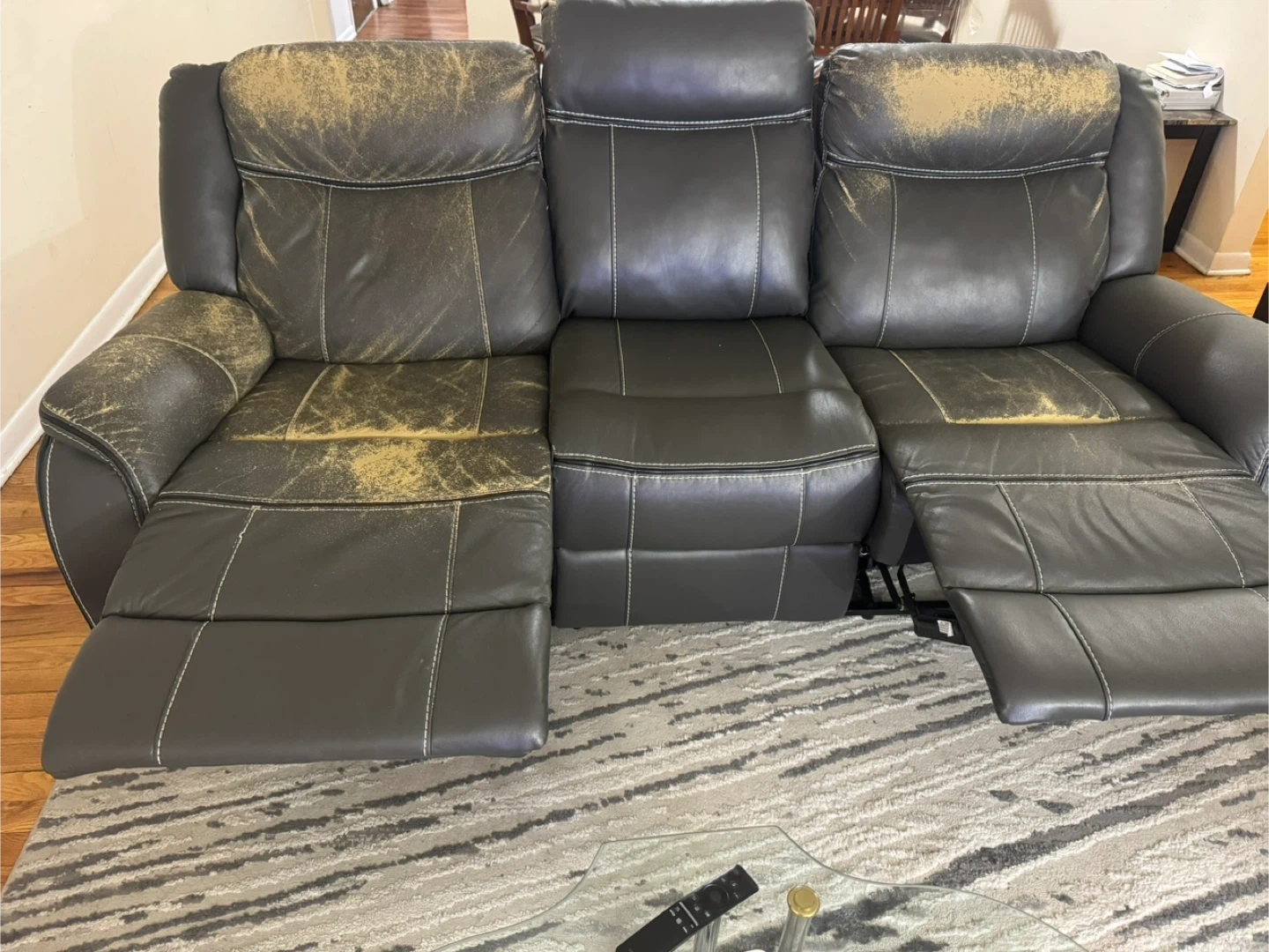This is a dark gray, 3-seater reclining sofa. It's upholstered in faux leather. The material shows wear and tear on the seat cushions and headrests. It features two reclining seats, one on each end.