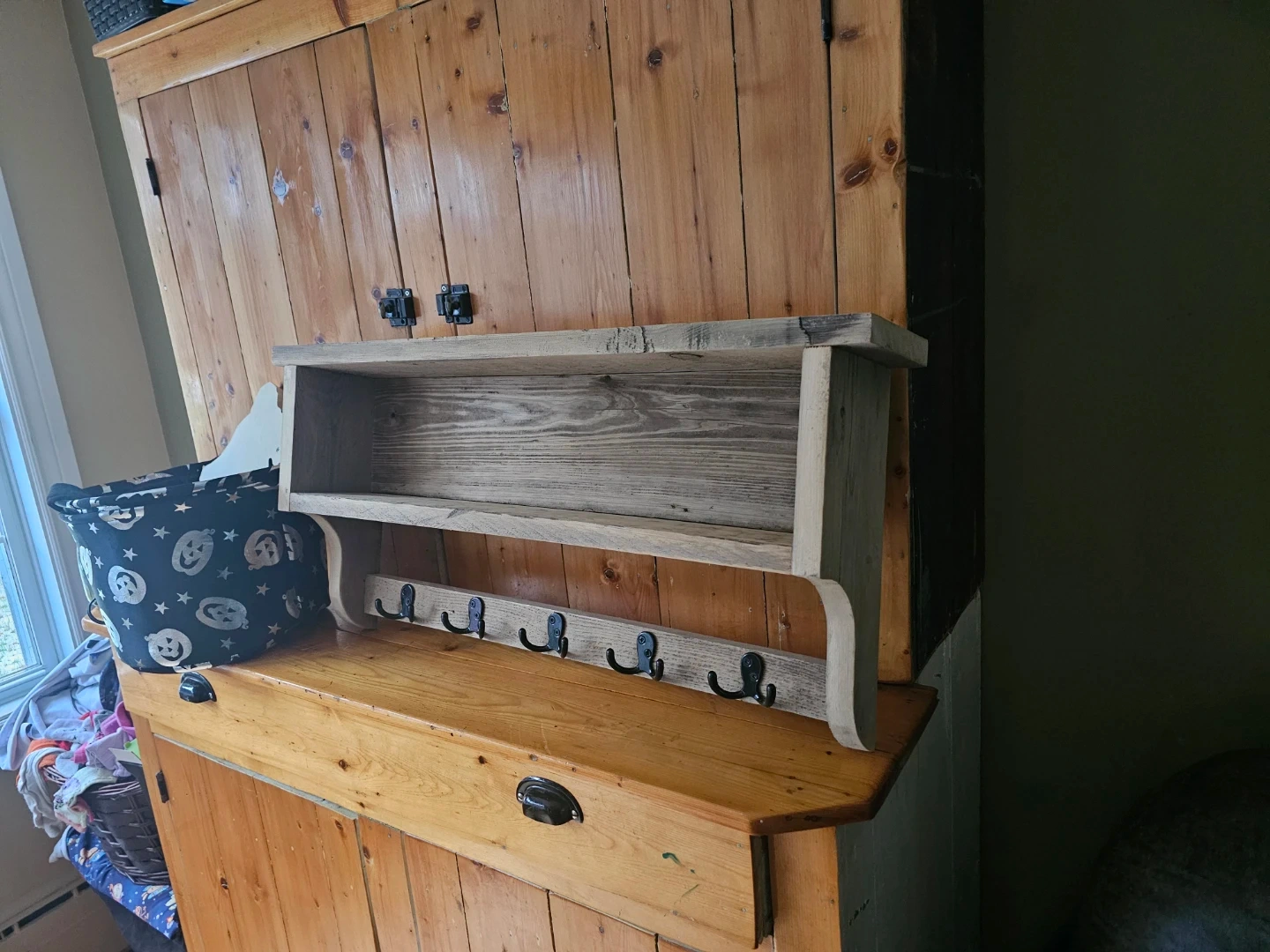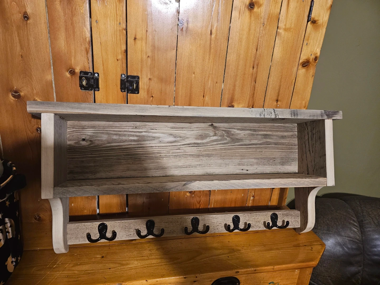 Rustic wooden shelf with five black metal hooks. Perfect for hanging coats, keys, or accessories by the door. Constructed from reclaimed wood for a unique look.