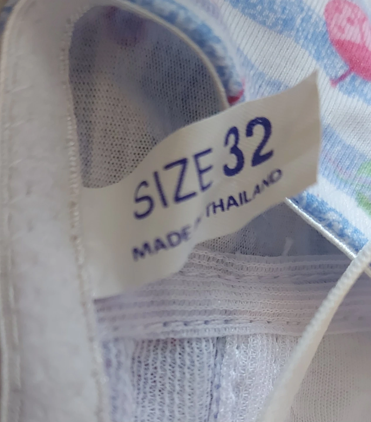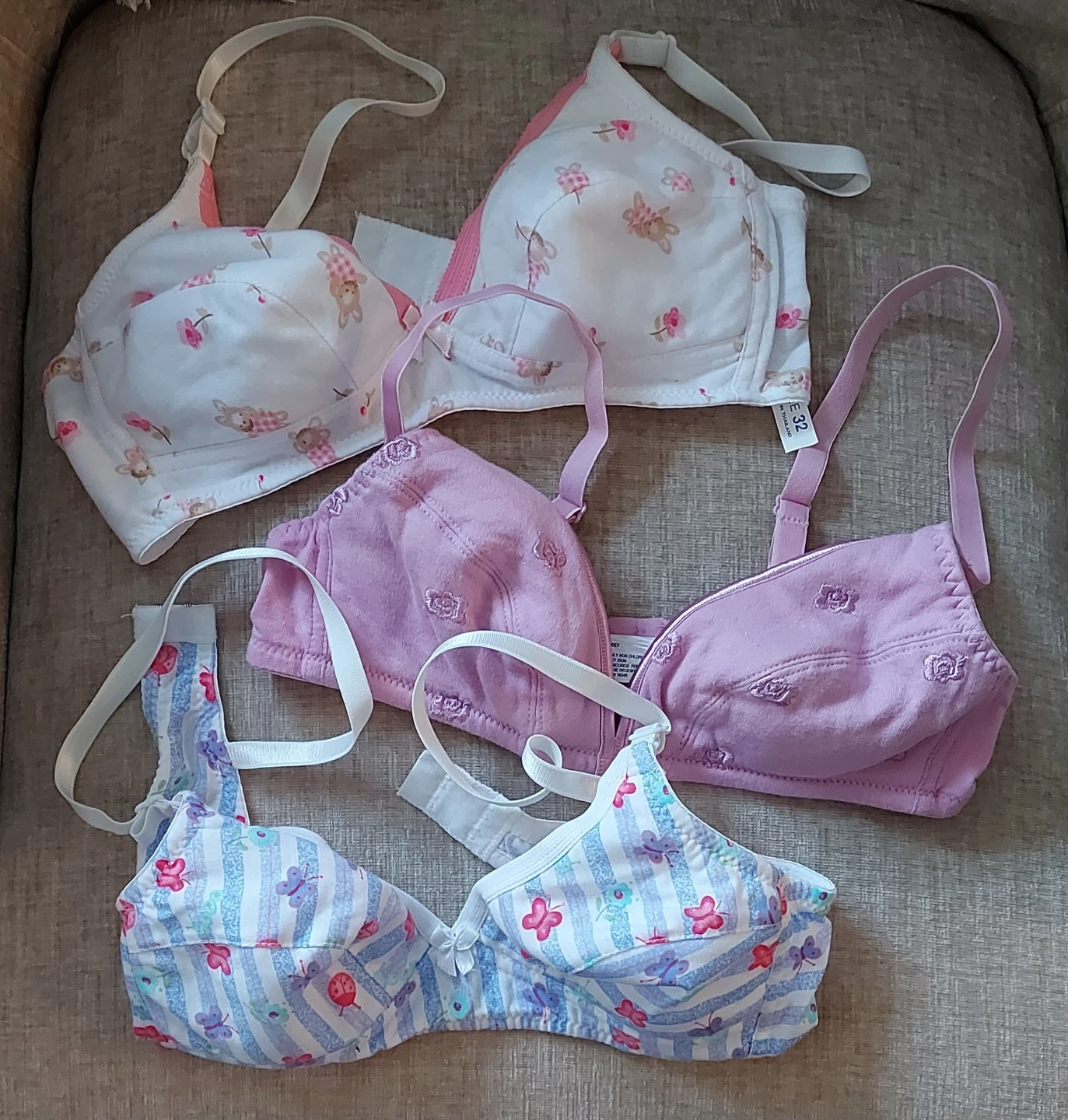 This lot includes three bras in various prints and colours. Two bras are size 32 and one is size 34A, made with fabric for comfort. They're suitable for everyday wear.