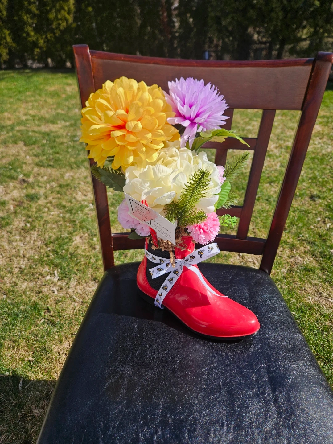 These are beautiful artificial flower arrangements. 1 Comes comes in a cute pink mug with 'Nana' written on it and includes a small chalkboard sign. It's perfect for adding a touch of colour to any room! 2 are in red Boots. The green has a solar light.