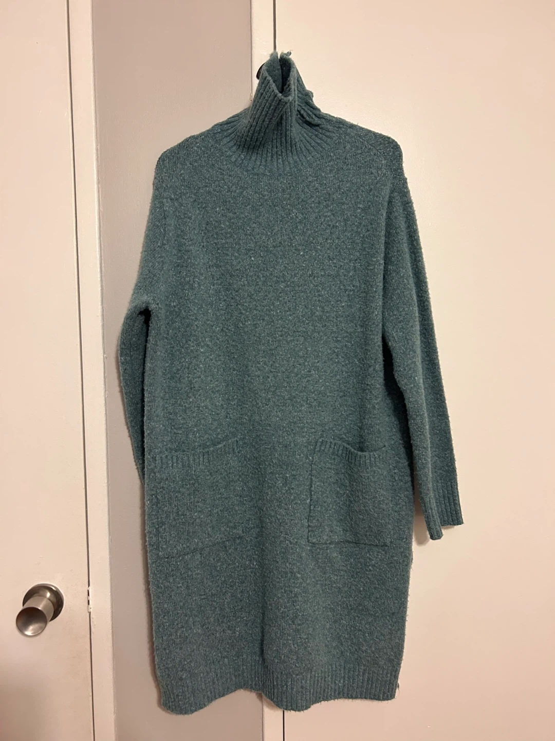 Cozy teal turtleneck sweater dress. It's got two front pockets and a relaxed fit. This dress is perfect for staying warm on chilly days!