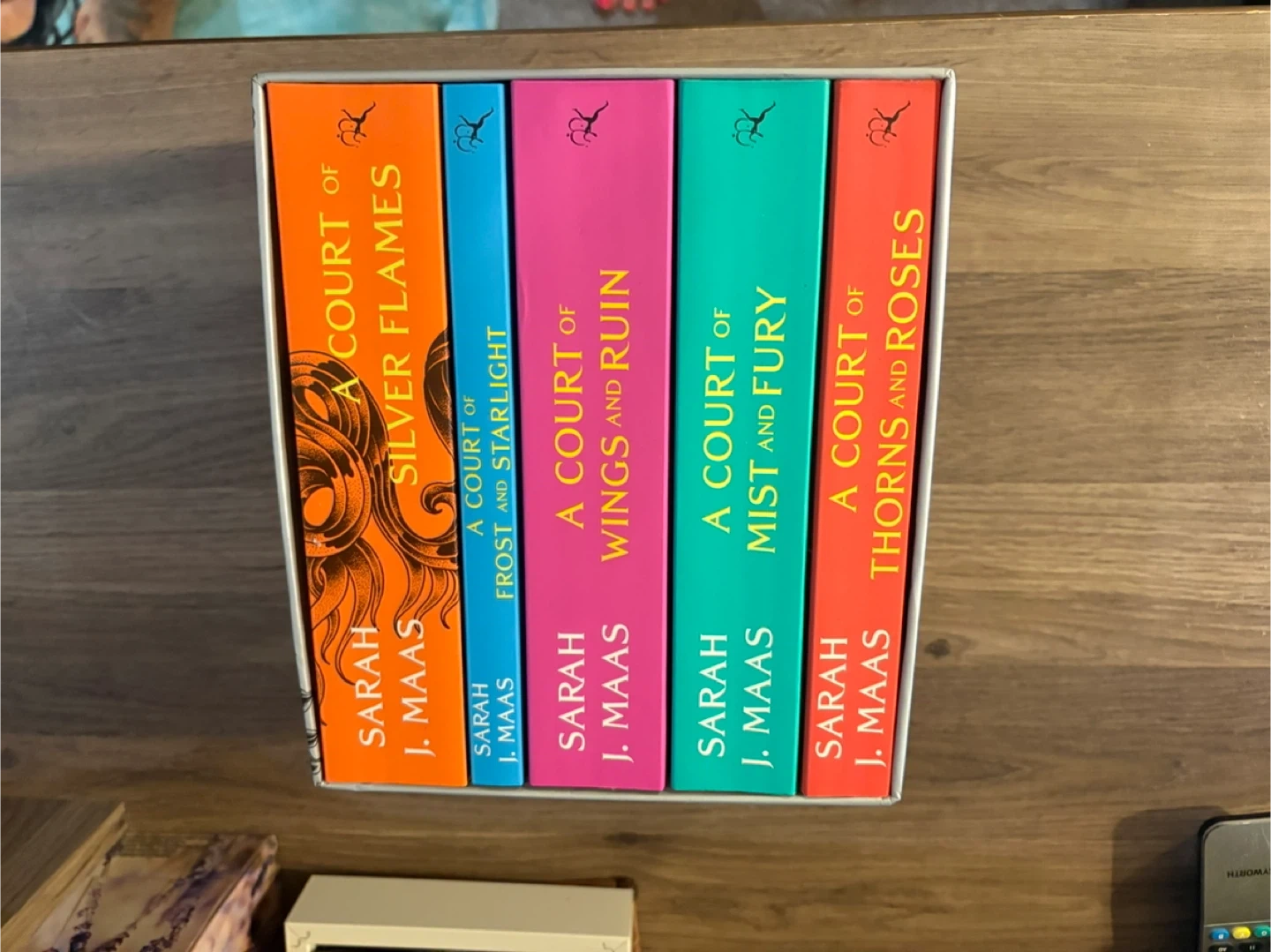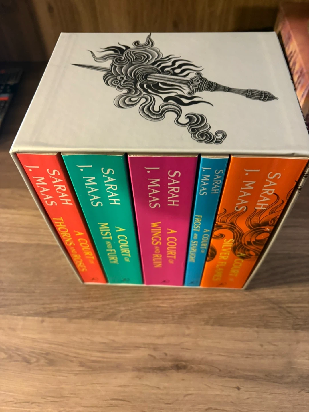 Selling the complete A Court of Thorns and Roses series by Sarah J. Maas! This set includes all five books in the main series: A Court of Thorns and Roses, A Court of Mist and Fury, A Court of Wings and Ruin, A Court of Frost and Starlight, and A Court of Silver Flames. All books are in great condition and come in the original box. Most weren’t even read (used digital copies)