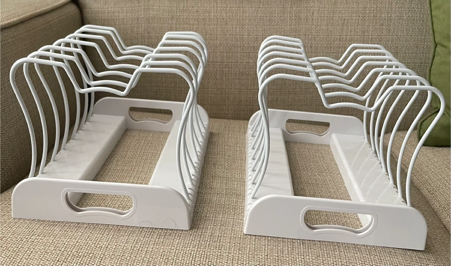 Two white organizers for plates, dishes, cutting boards, and pot lids. Each organizer has multiple slots to keep your kitchen items tidy. These holders have handles for easy transport. They're great for saving kitchen counter space. Excellent condition, like new. From smoke-free, pest-free, and pet-free home.