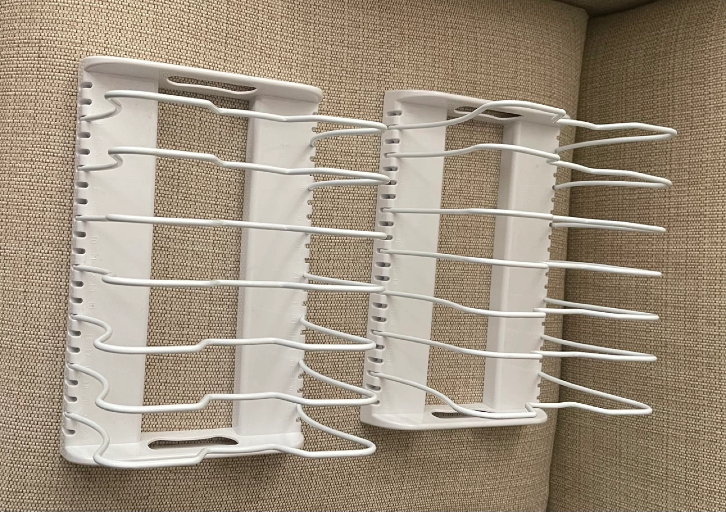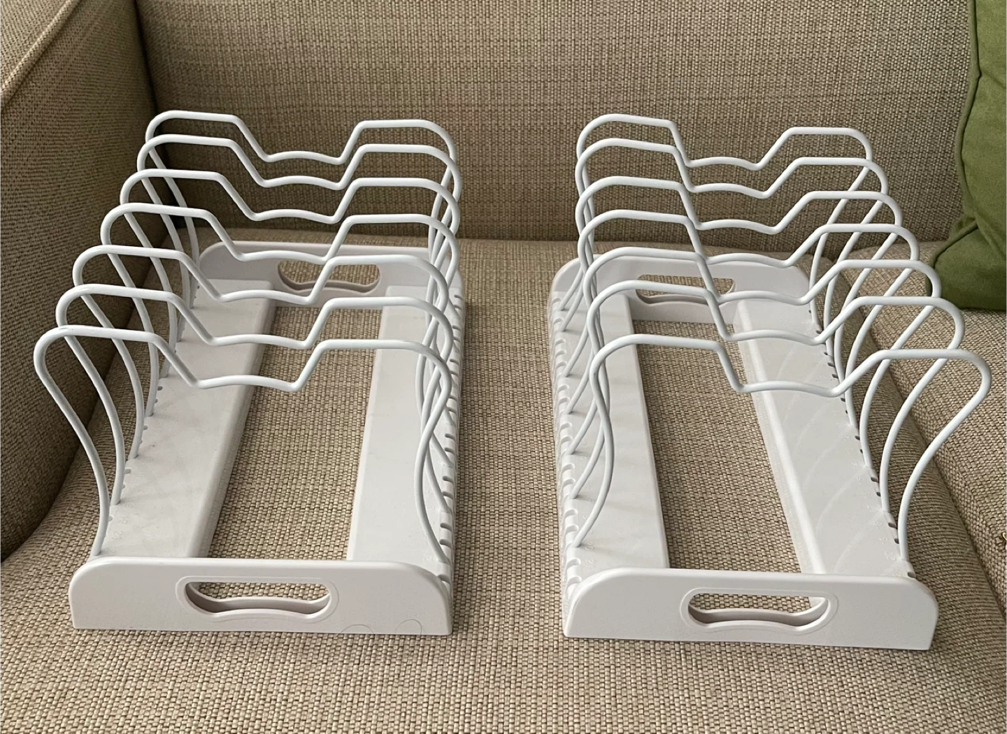 Two white organizers for plates, dishes, cutting boards, and pot lids. Each organizer has multiple slots to keep your kitchen items tidy. These holders have handles for easy transport. They're great for saving kitchen counter space. Excellent condition, like new. From smoke-free, pest-free, and pet-free home.