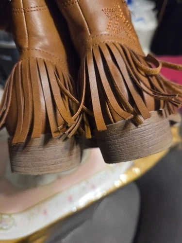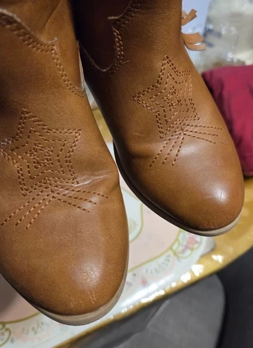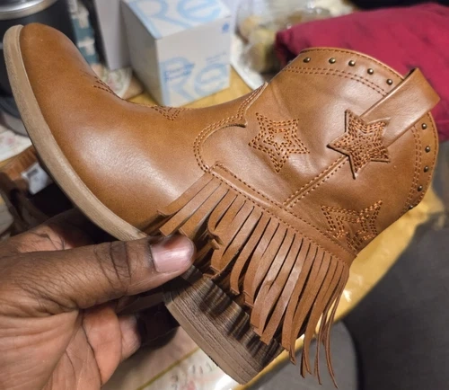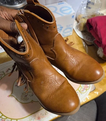Adorable western-style ankle boots by Dream Pairs, perfect for boys or girls. These boots feature classic star embroidery, a stylish fringe block heel, and an easy pull-on design. Great for fall outfits, western wear, school, or everyday use. Condition: Pre-owned and in good condition. Light cosmetic scuffs on the front toe area from normal wear. No rips, no cracks, no odors. Structurally sound and ready to wear. Details: Brand: Dream Pairs Style: Western / Cowboy / Cowgirl Ankle Boots Color: Brown Material: Synthetic leather upper Closure: Pull-on with back loop Heel: Block heel with fringe detail Toe: Round toe Gender: Kids / Boys / Girls. Comfortable, stylish, and versatile — these boots pair perfectly with jeans, dresses, and fall outfits. Retail for over $60 CAD new. Feel free to message if you have any questions!