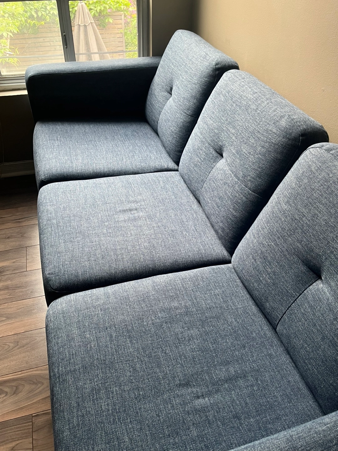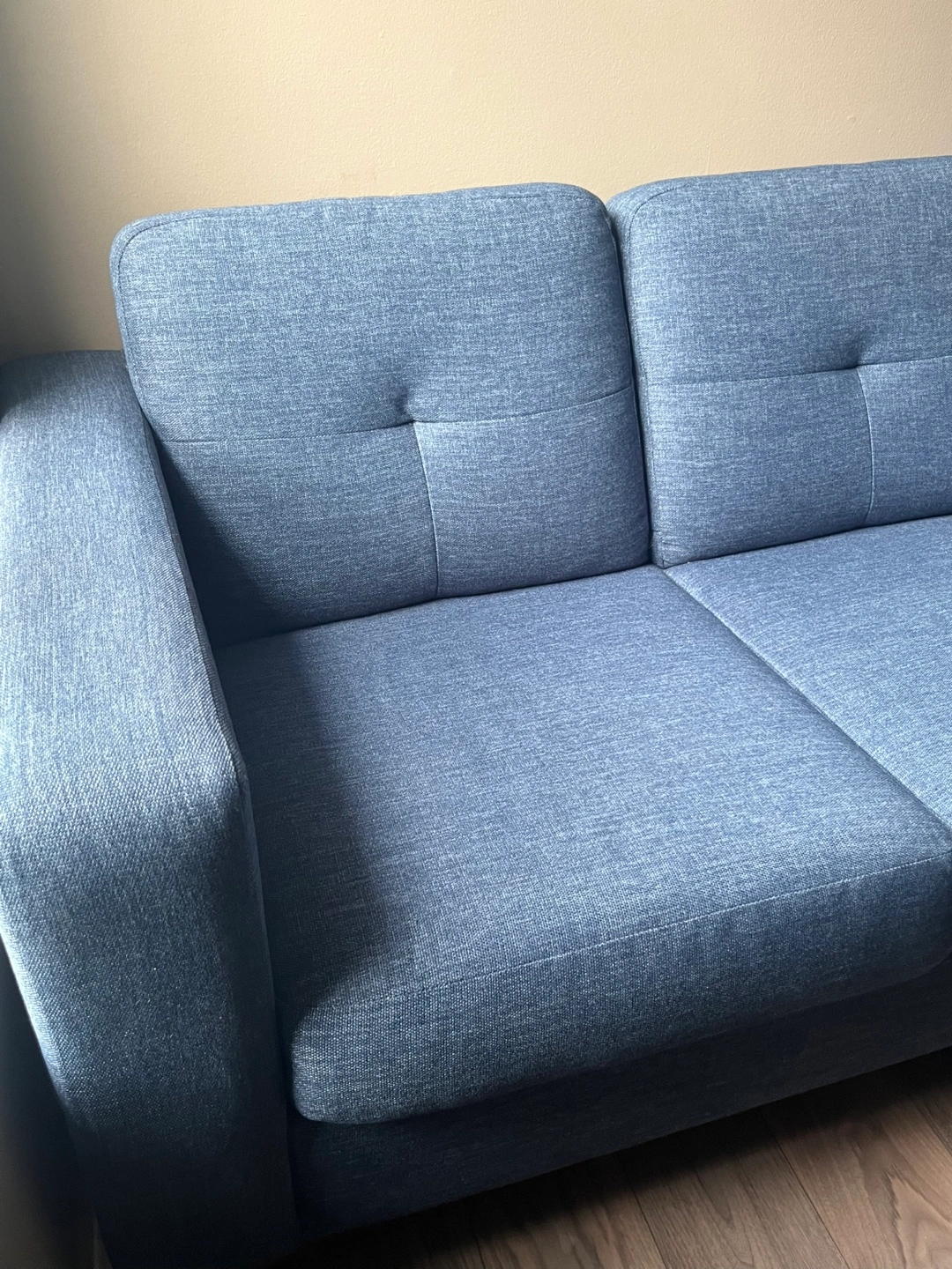 I was very happy with this couch. It’s medium-firm and SUPER comfortable. I’m just changing up my colour scheme in my new place, so blue no longer works for me.
