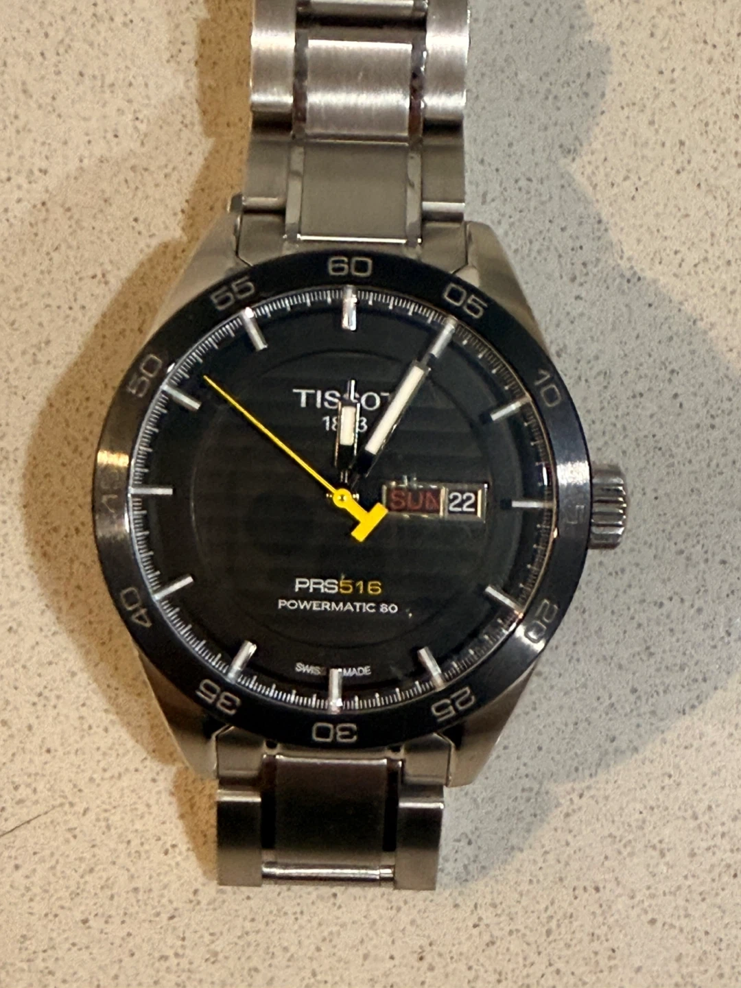 Selling a Tissot PRS 516 Powermatic 80 watch. It features a stainless steel band and a black dial with a yellow second hand. The watch is water resistant to 100m. Hardly worn, great condition. Does NOT come with extra links to lengthen it unfortunately, so you will want to try it on first before buying.