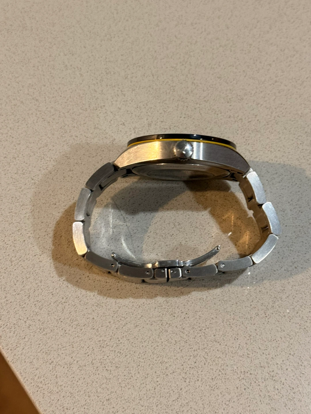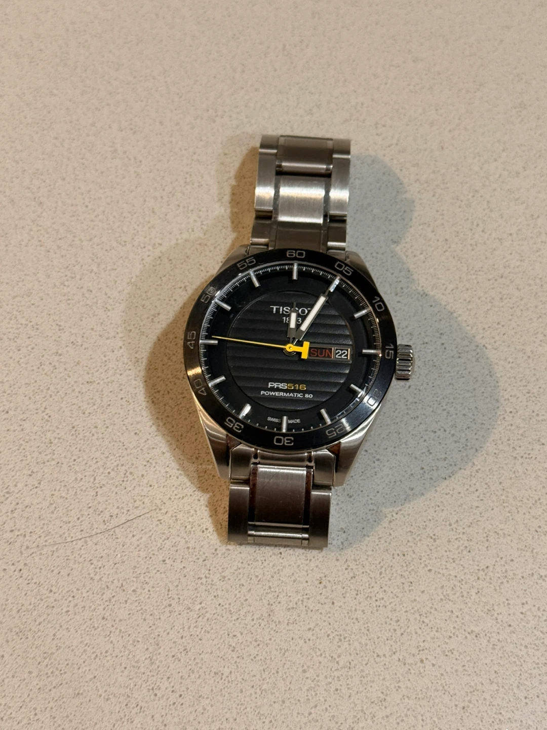 Selling a Tissot PRS 516 Powermatic 80 watch. It features a stainless steel band and a black dial with a yellow second hand. The watch is water resistant to 100m. Hardly worn, great condition. Does NOT come with extra links to lengthen it unfortunately, so you will want to try it on first before buying.
