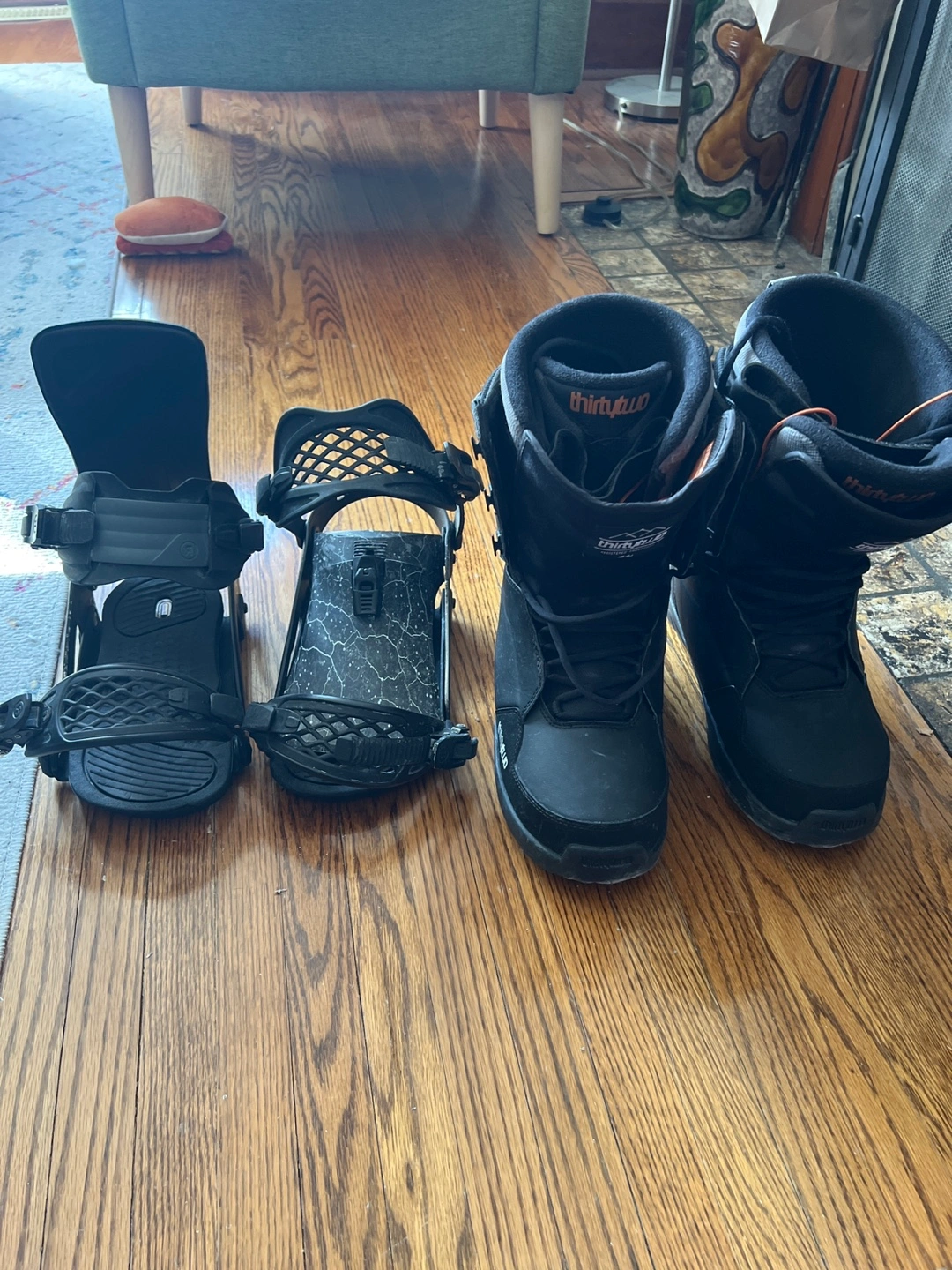 Upper strap on right binding replaced with a Ride strap and boots are good. Both still in very good condition. Ideal for someone looking to start. Size of the boot is 10.5 and the bindings are large. Selling each for 50 bucks or together as a package for 75 bucks.