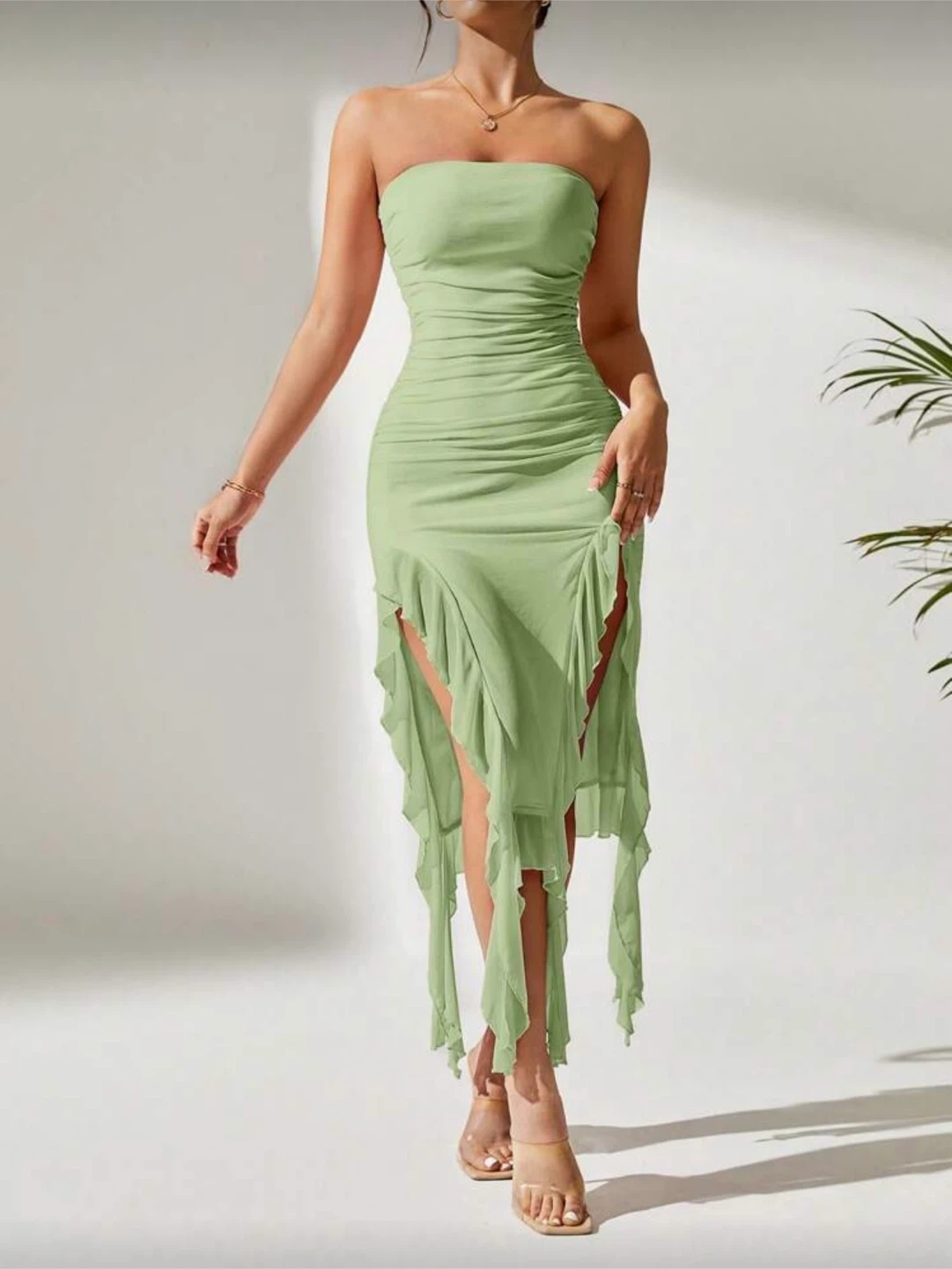 Light Green Ruched Strapless Dress with Ruffle Slits