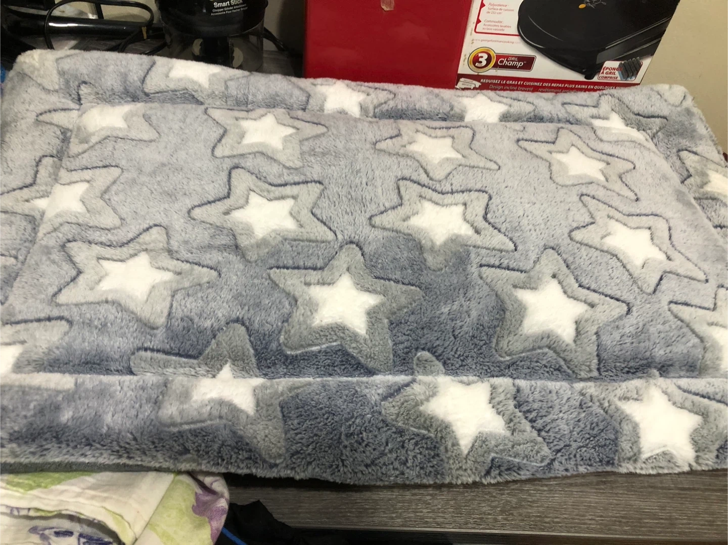 Selling a Medium cozy pet bed with a cute grey and white star pattern! It's in great condition and perfect for keeping your furry friend comfortable. The bed appears to be a soft, plush material. It is approximately 30 inches long and 20 inches wide!