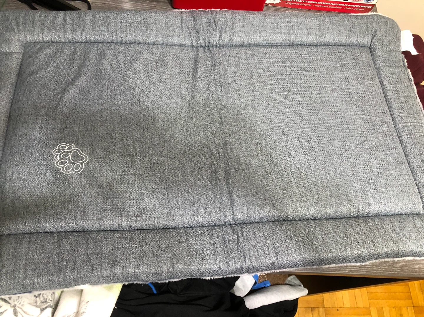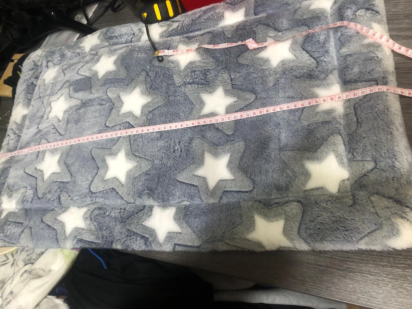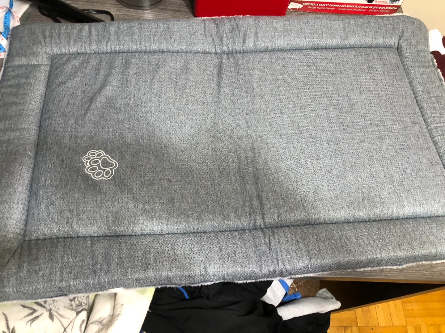 Selling a Medium cozy pet bed with a cute grey and white star pattern! It's in great condition and perfect for keeping your furry friend comfortable. The bed appears to be a soft, plush material. It is approximately 30 inches long and 20 inches wide!