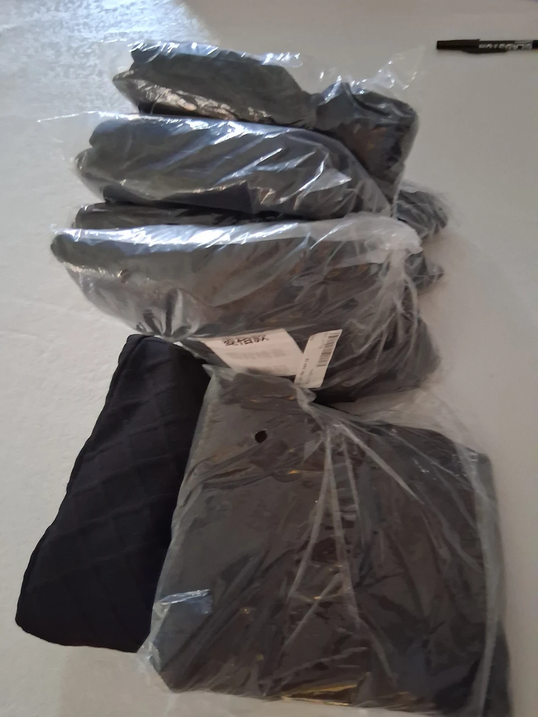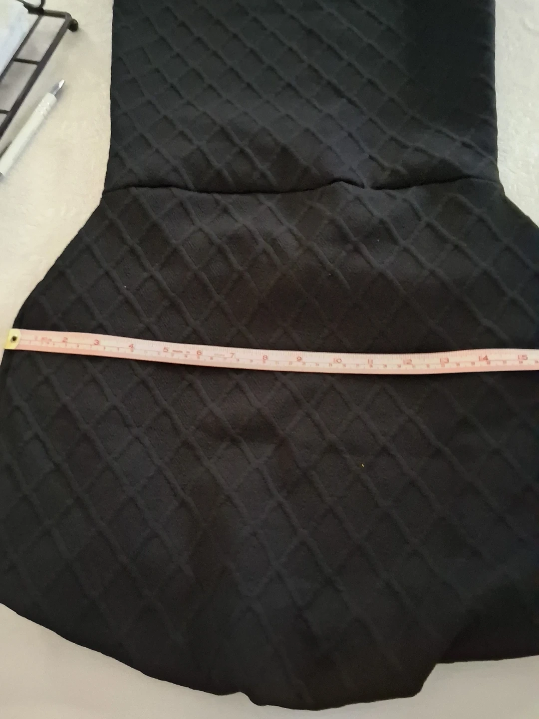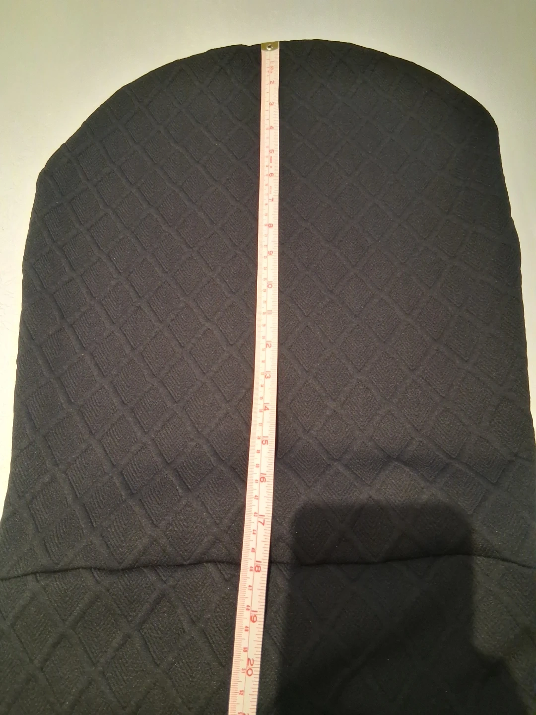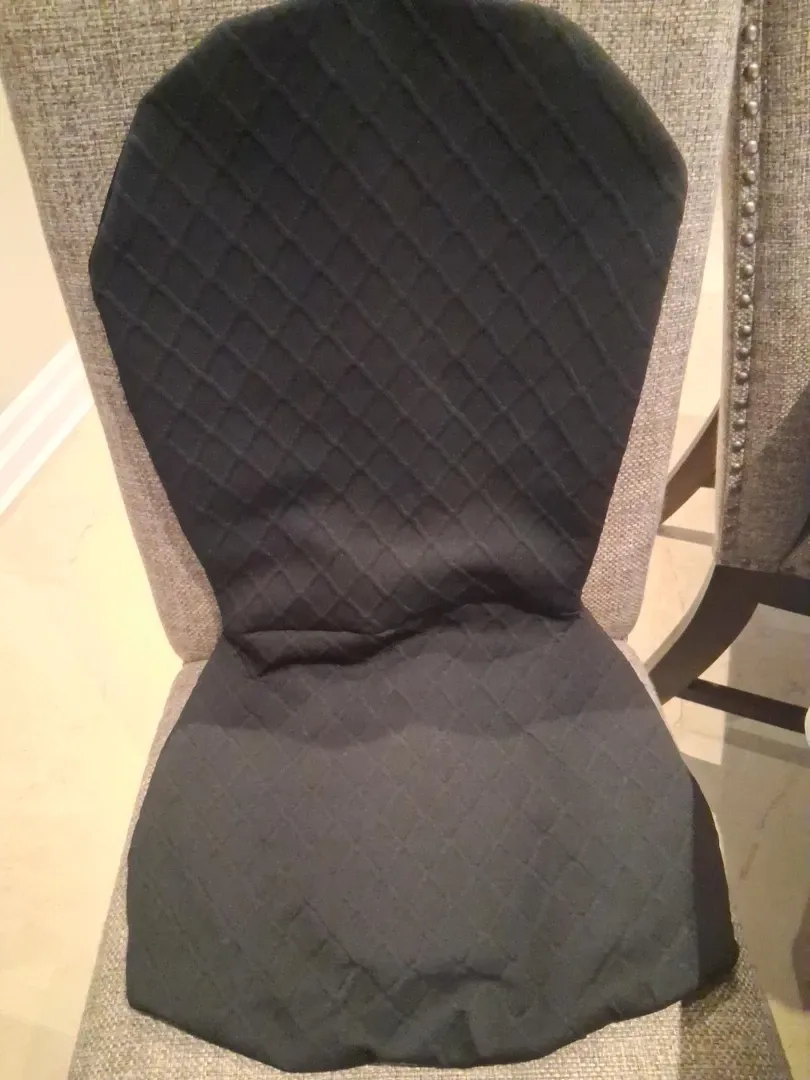 6 Black quilted fabric chair back cover. It measures approximately 19 inches in length and 16 inches across the widest part of the seat section. Fabric has a subtle diamond pattern. Easy to slip on to protect or update chair backs.