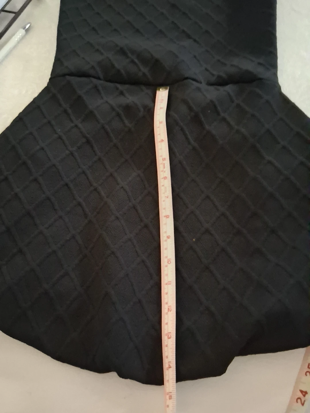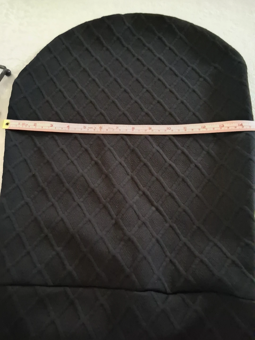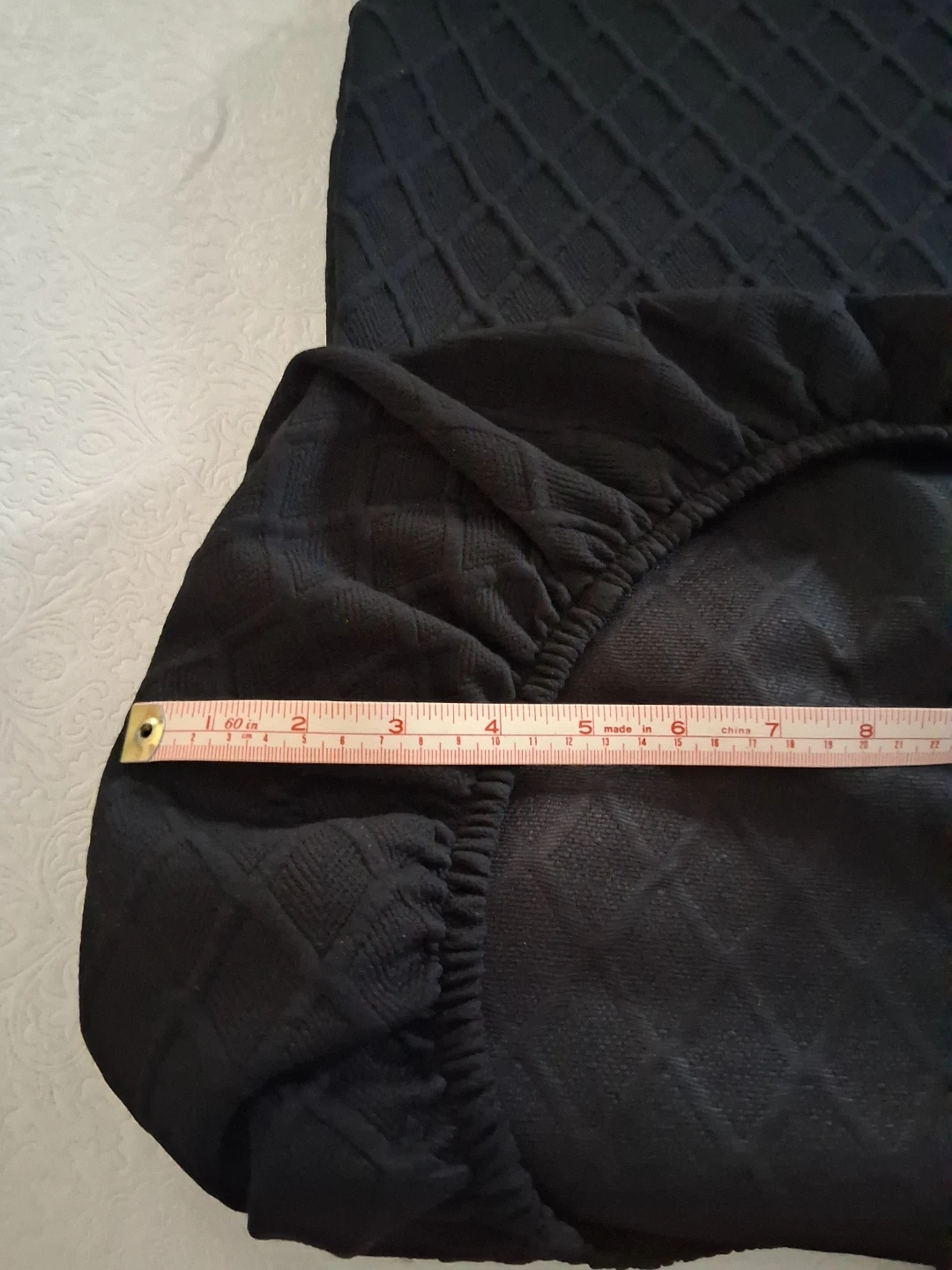 6 Black quilted fabric chair back cover. It measures approximately 19 inches in length and 16 inches across the widest part of the seat section. Fabric has a subtle diamond pattern. Easy to slip on to protect or update chair backs.