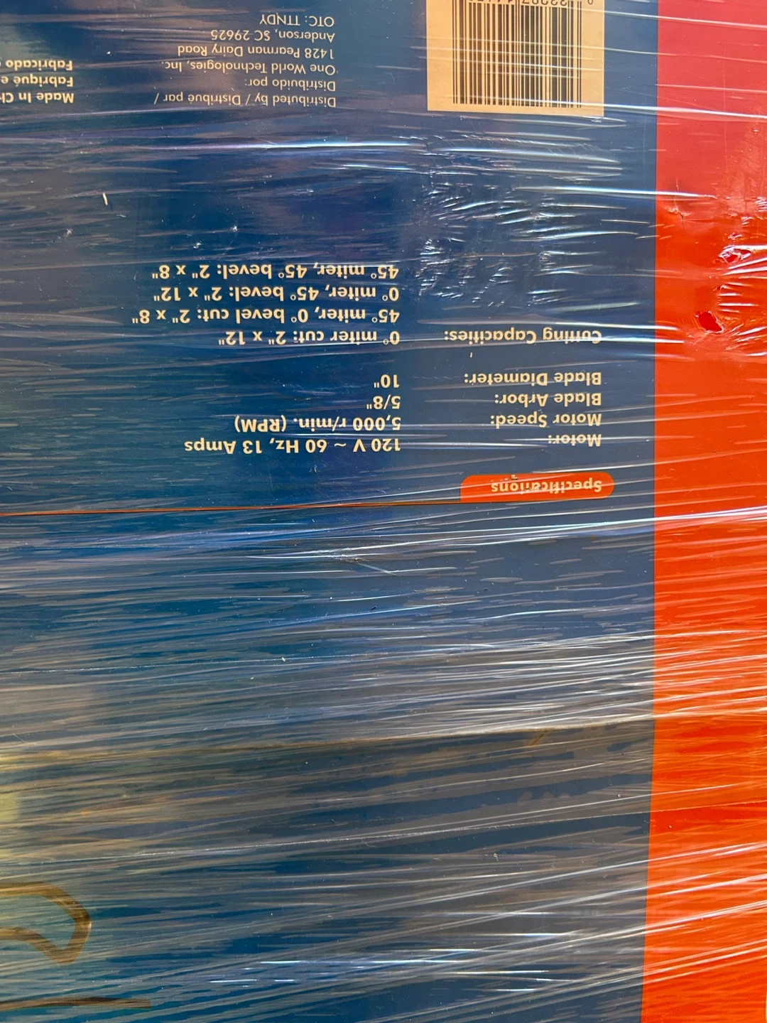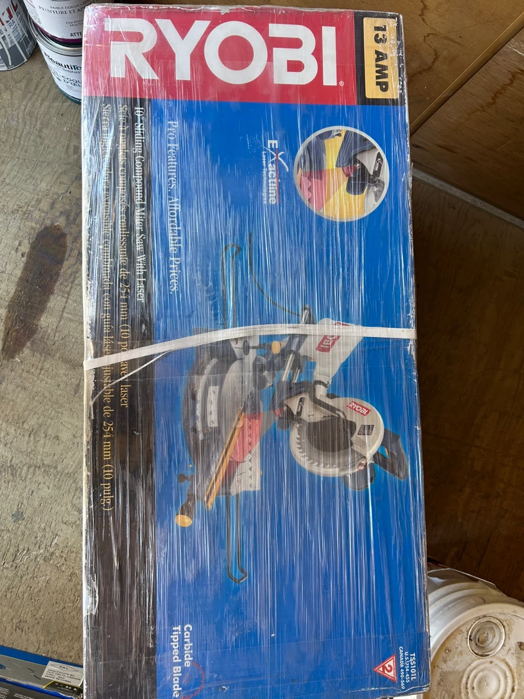 Ryobi 13 Amp 10-inch compound miter saw. It's built with a 5/8 inch arbor and a 120V, 60 Hz motor. This saw can cut 0° miter at 2" x 12" and 45° miter at 2" x 8". Stand included