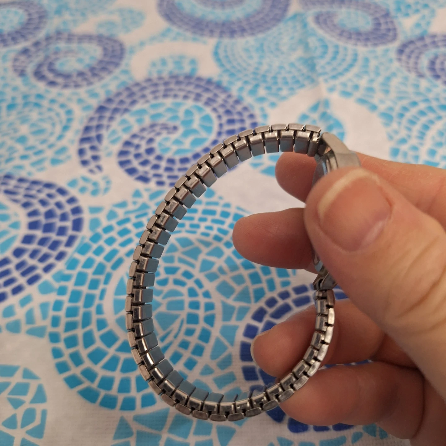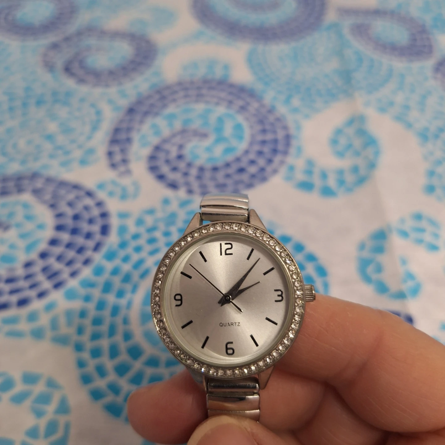 This is a women's watch with a classic silver-tone dial and a comfortable stretch band. It features a sparkling rhinestone bezel for a touch of elegance. The watch has a reliable quartz movement. Great for everyday wear!