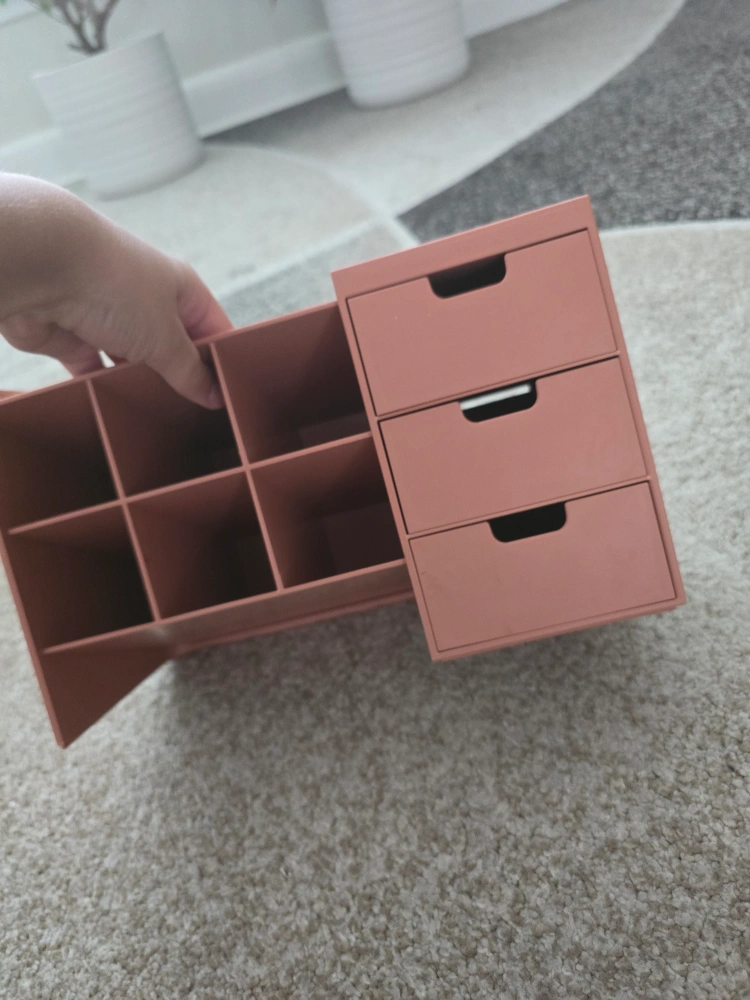 This organizer features 3 drawers, 8 compartments and a removable top tray. It is a great way to store and organize all of your makeup products.