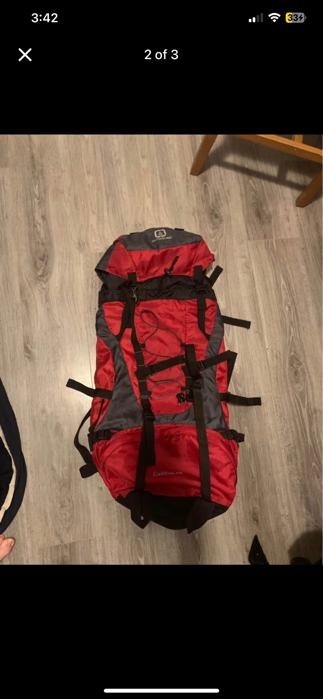 Large capacity backpack, great for hiking or camping. Red and grey colour scheme. Multiple straps and compartments. Equivalent of 60L of storage. Retails $150 at Canadian Tire