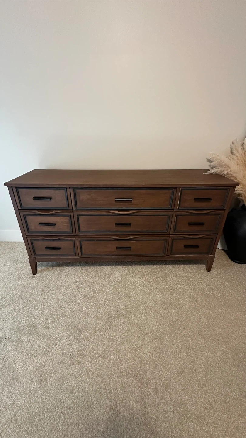 A spacious dresser featuring nine drawers for ample storage. The dark wood finish offers a classic look. Drawer pulls are black. It's a solid piece for any bedroom.