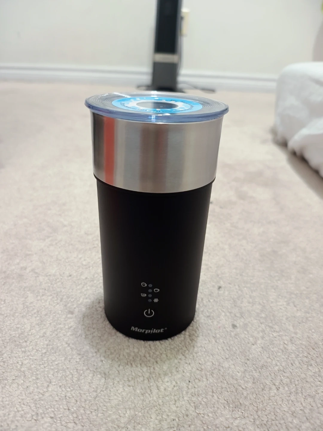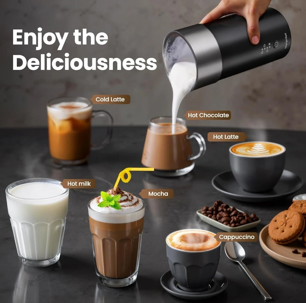 This Morpilot milk frother can foam or heat milk. It has 4 modes: warm and dense, warm and airy, hot milk, and cold foam. It comes with a whisk attachment and has indicator lights.