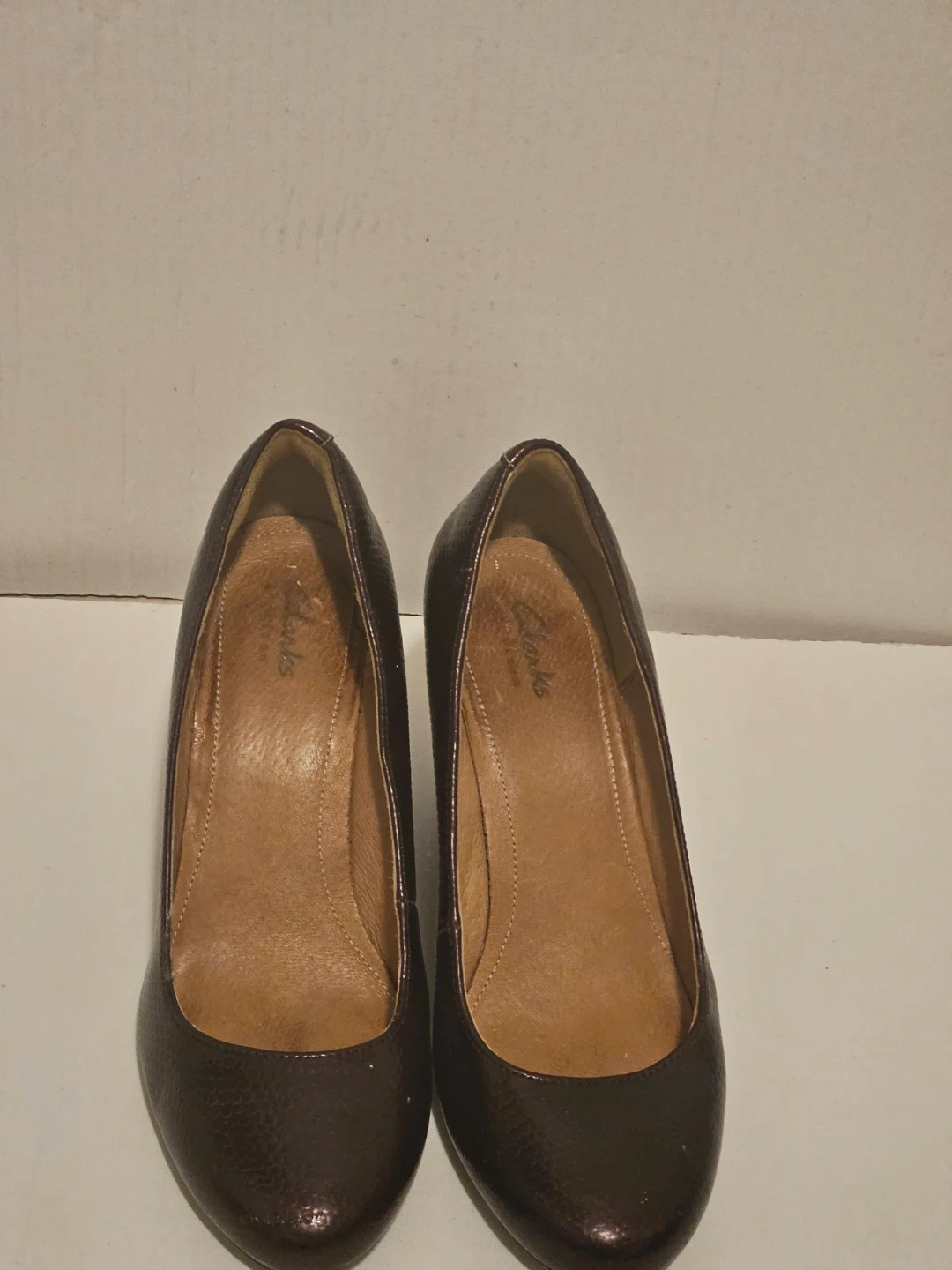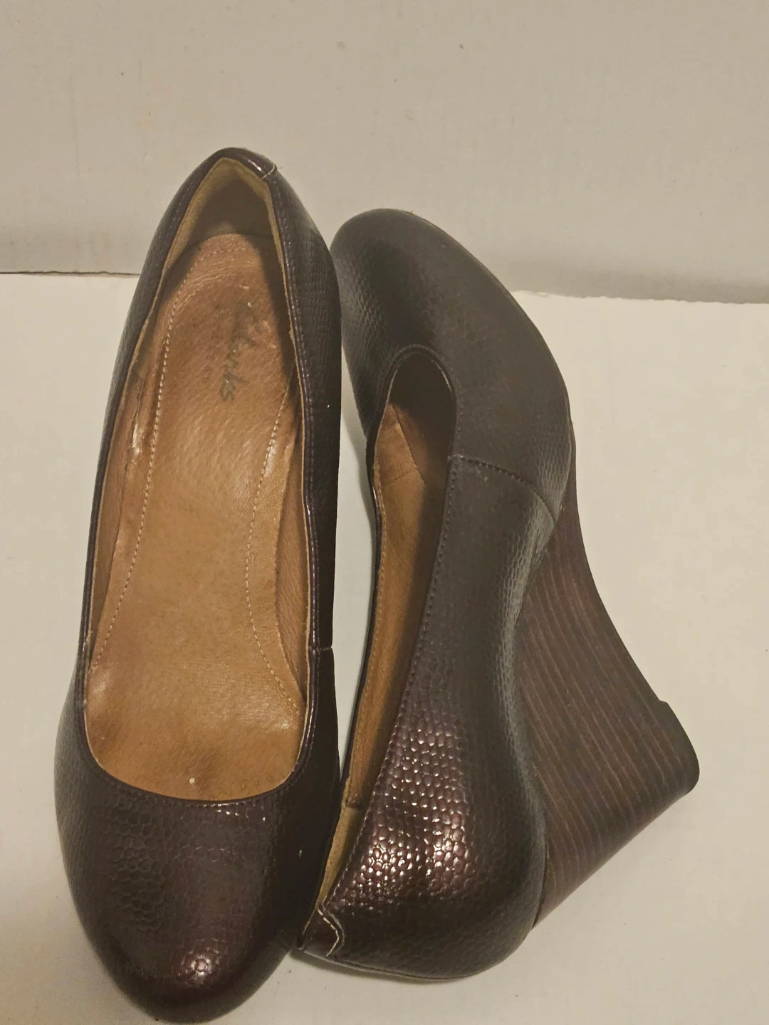 Selling a pair of Clarks wedge heel shoes in a dark brown colour. They are in good condition and have a unique design on the sole. Perfect for adding a bit of height and style to your outfit!