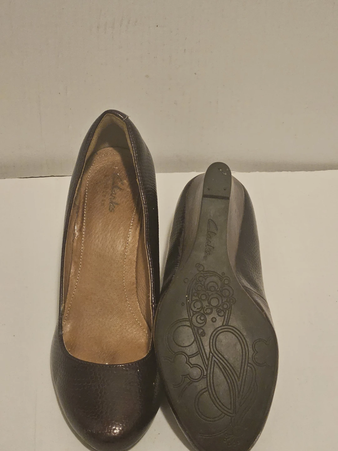 Selling a pair of Clarks wedge heel shoes in a dark brown colour. They are in good condition and have a unique design on the sole. Perfect for adding a bit of height and style to your outfit!