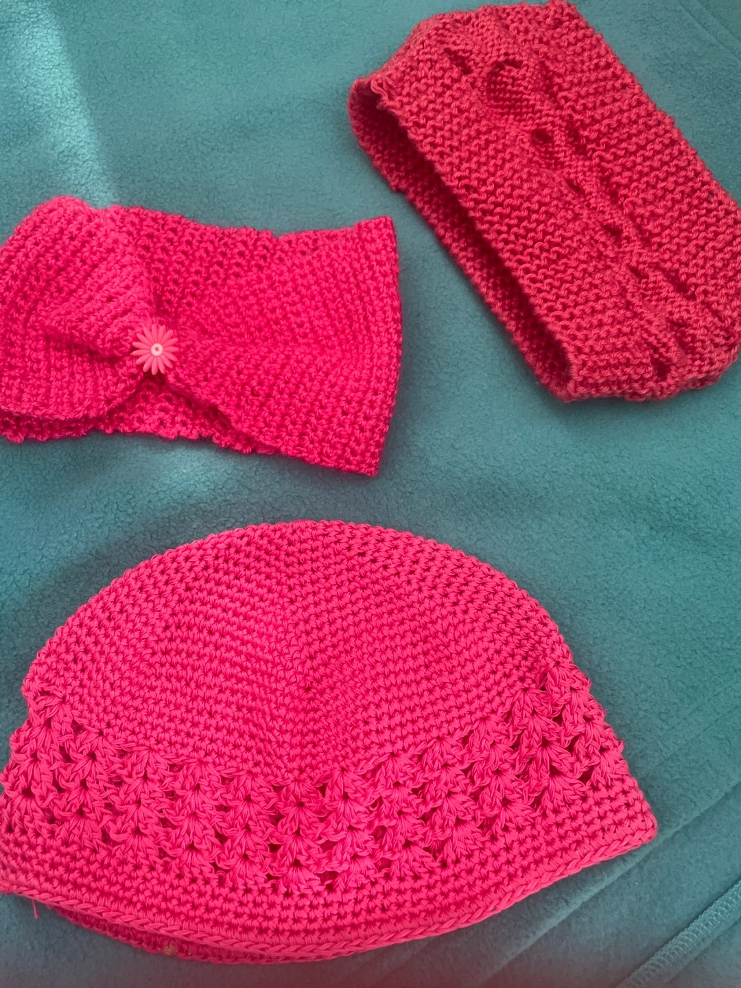 A cute set of three hand-knitted pink baby accessories. Includes a soft hat with a lace-like pattern and two coordinating headbands, one with a decorative flower. Perfect for keeping your little one stylish and warm!