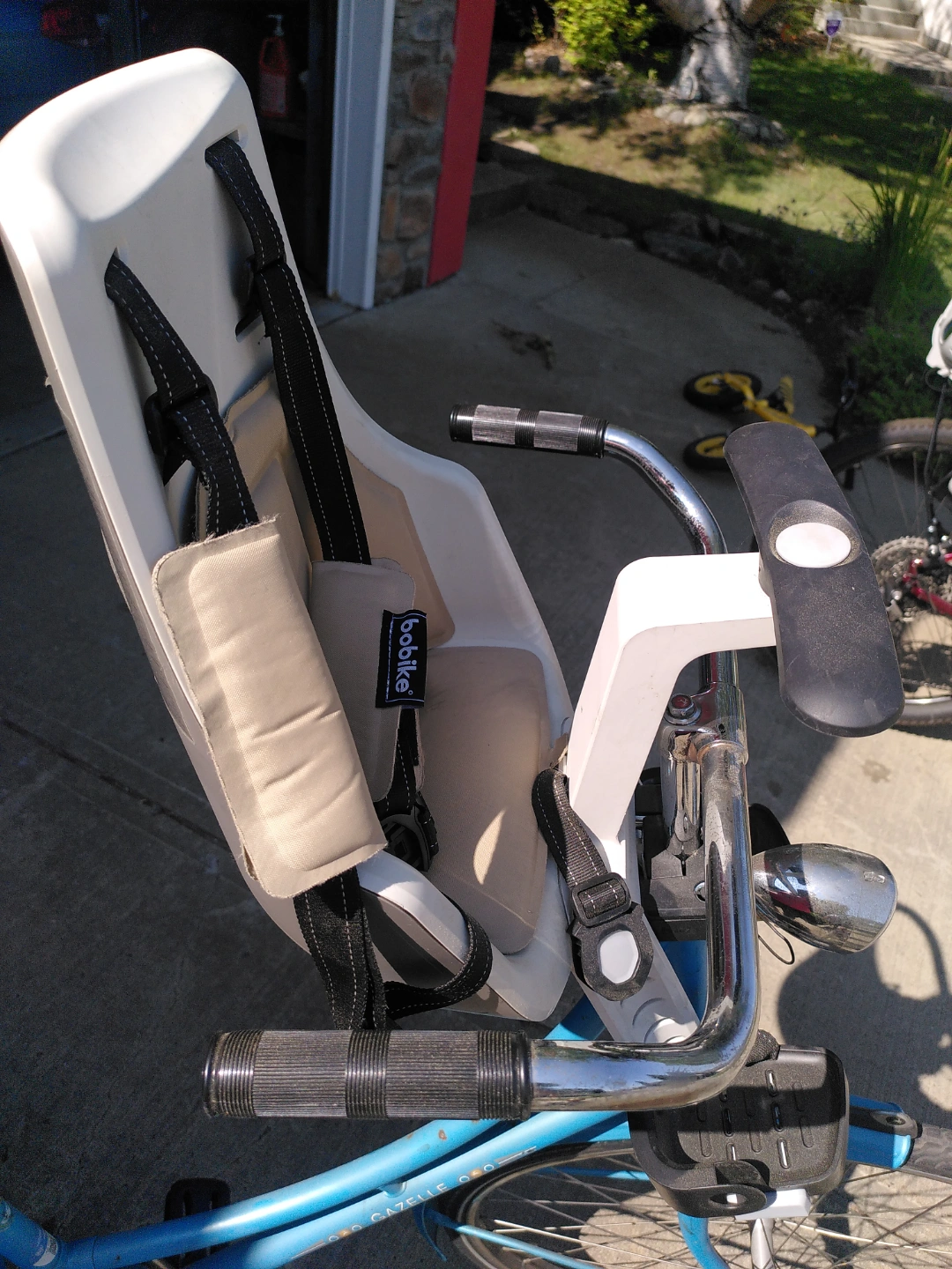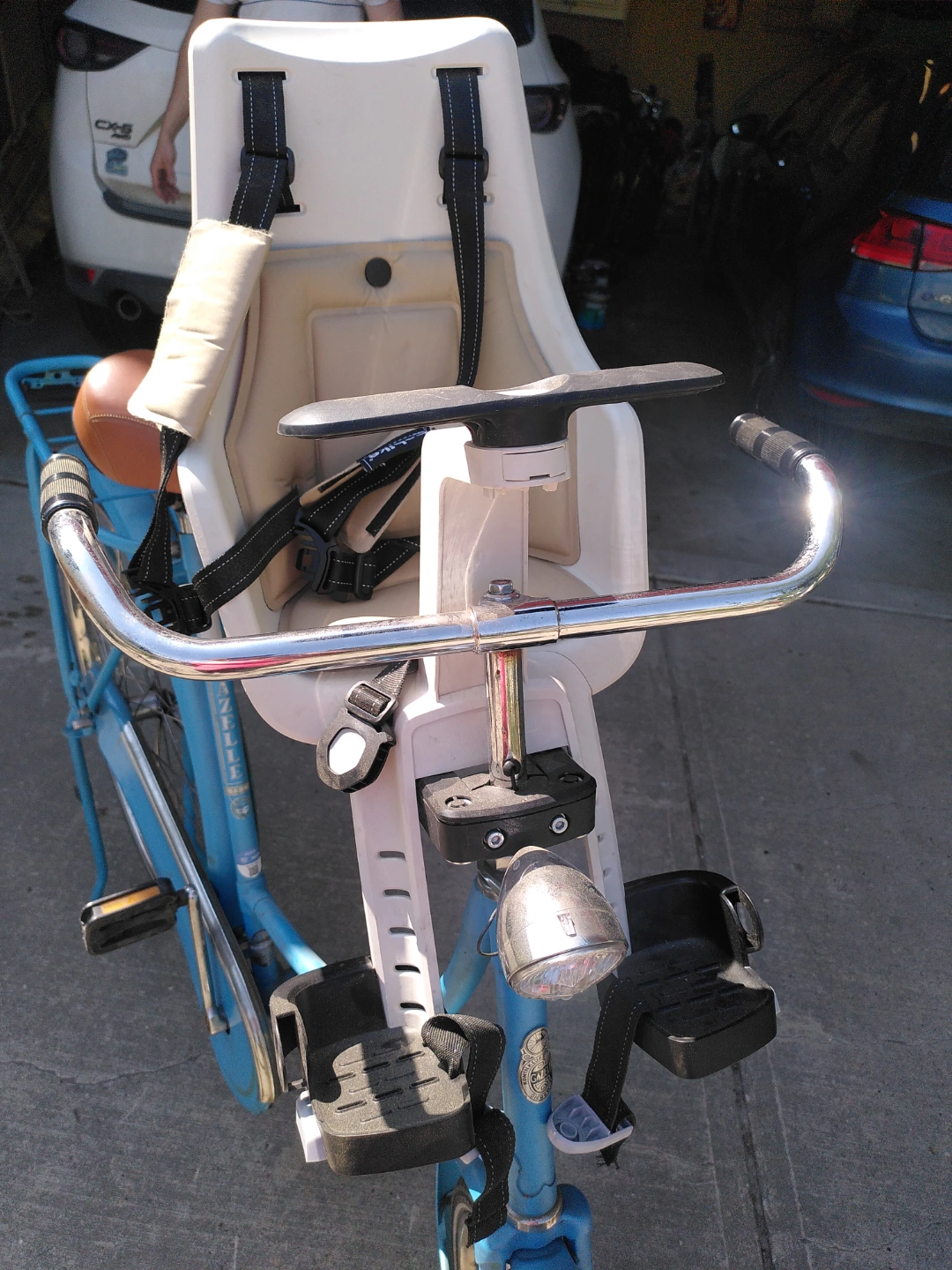 Child bike seat, in white and beige colours. A comfortable way to enjoy bike rides with your little ones.