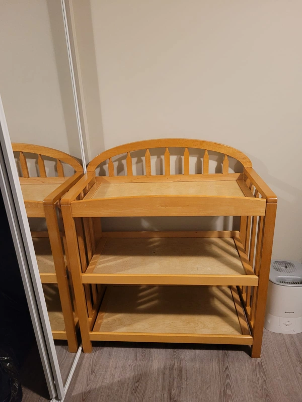 This is a wooden baby changing table. It features three open shelves for storage. The changing surface has raised sides for safety. It's made of light-coloured wood. This would be useful for organizing baby essentials during diaper changes.