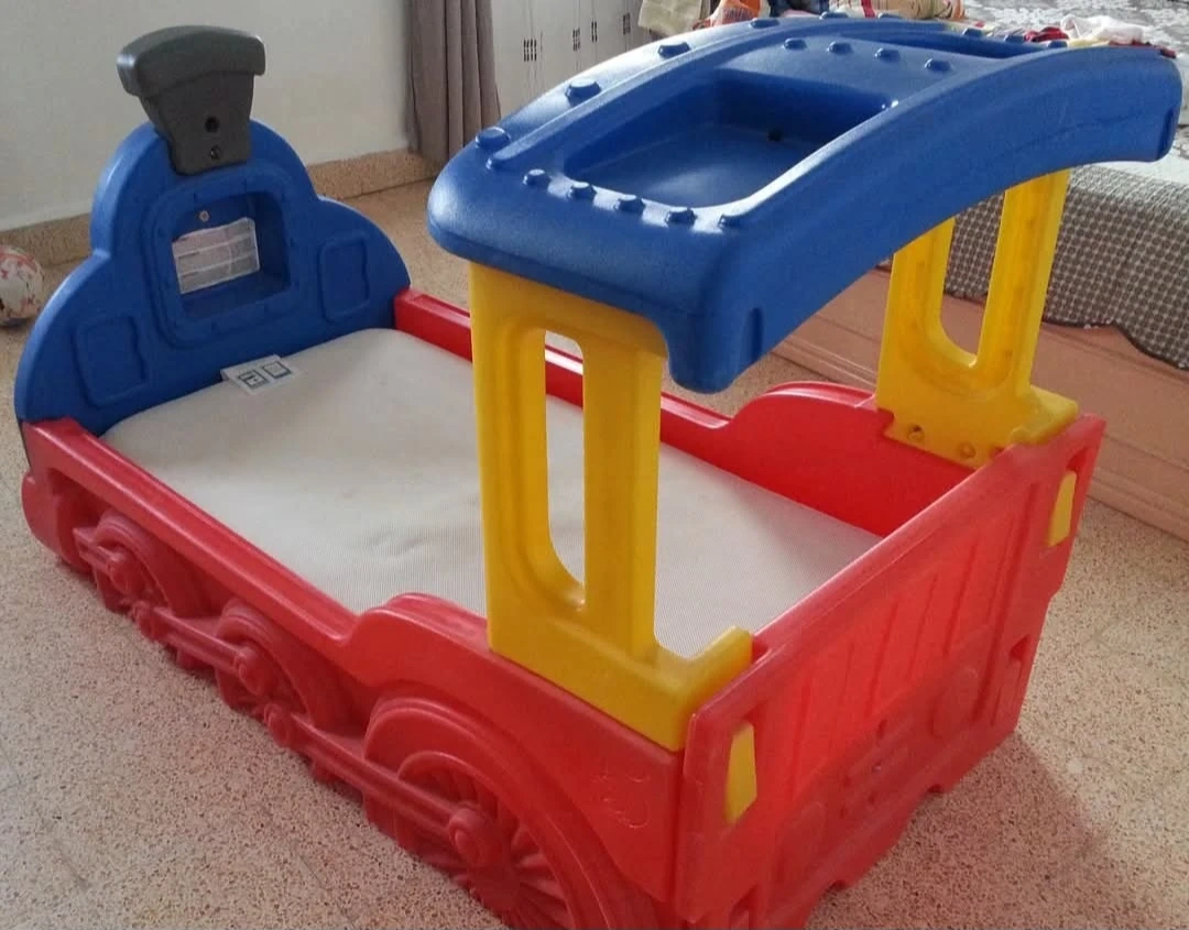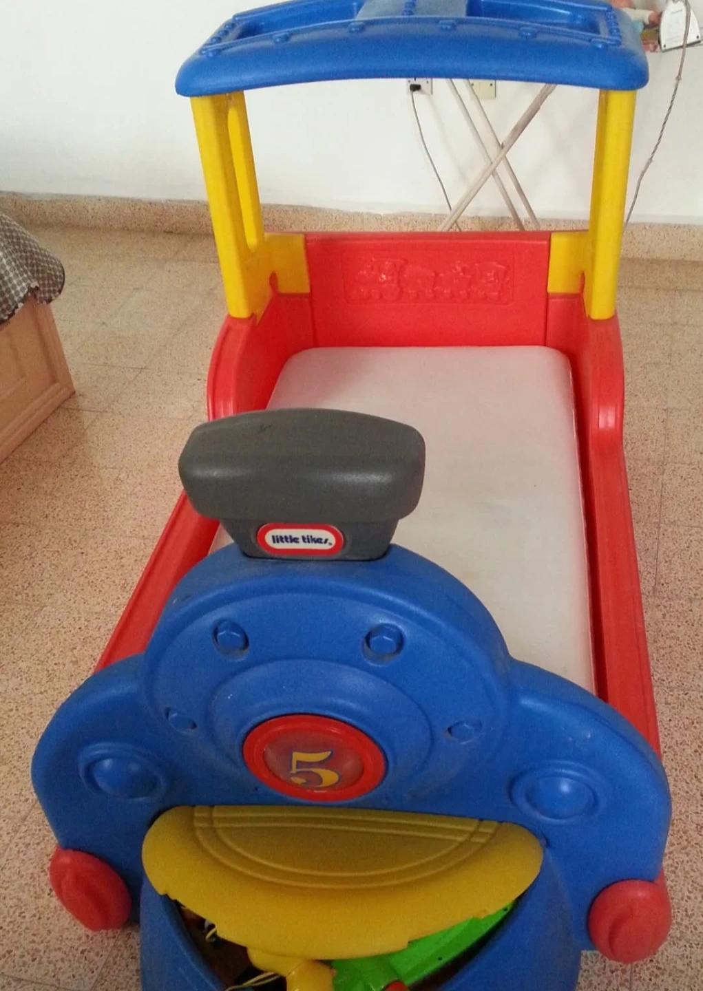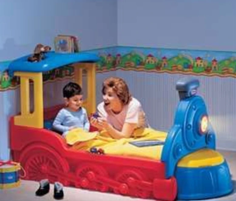 Choo-choo! All aboard the Little Tikes Train Bed! This fun toddler bed is shaped like a train and is perfect for transitioning your little one from a crib to a bed. It's made of durable plastic and features a colourful design in red, blue, and yellow. Your child will love going to sleep in this unique and playful bed!