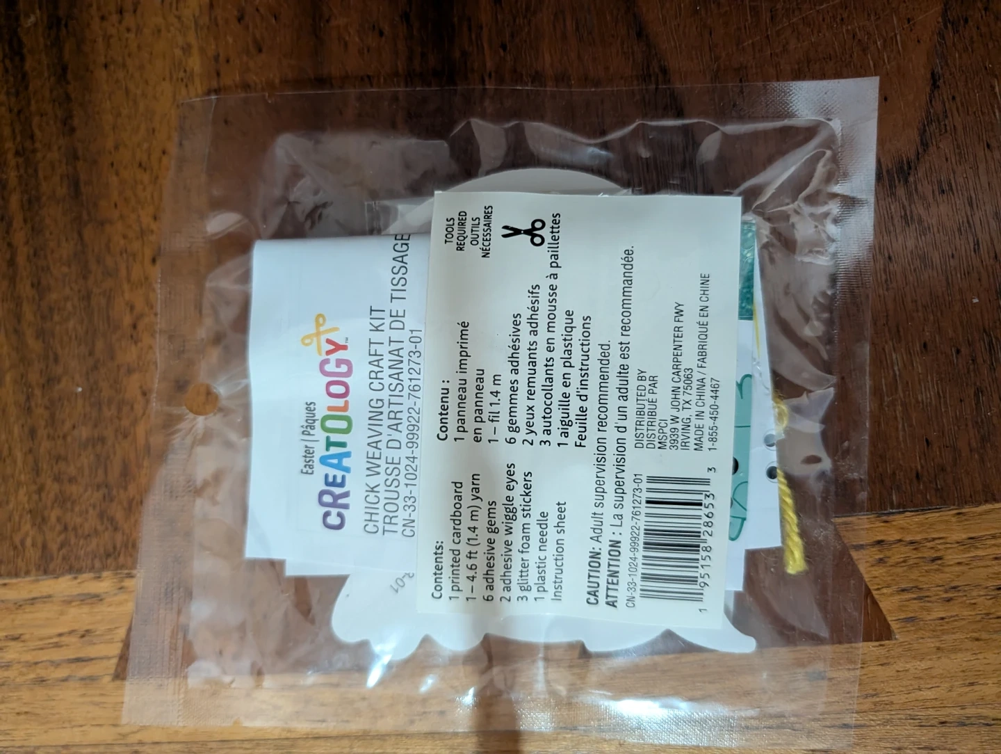 This kit includes 1 printed cardboard chick, 1.4m yarn, and 6 adhesive gems. It also comes with 3 glitter foam stickers and 2 adhesive wiggle eyes. Recommended for ages 6+.