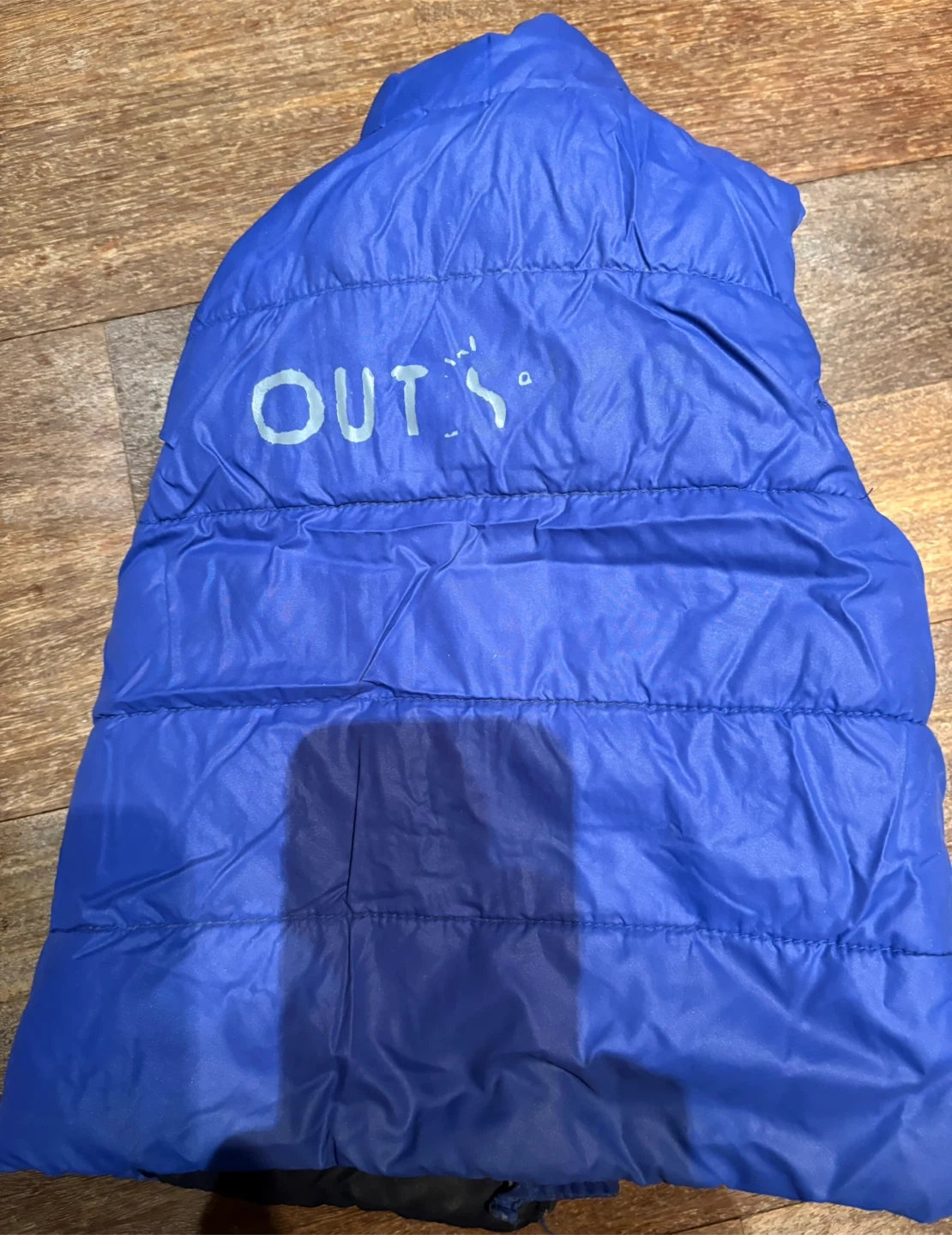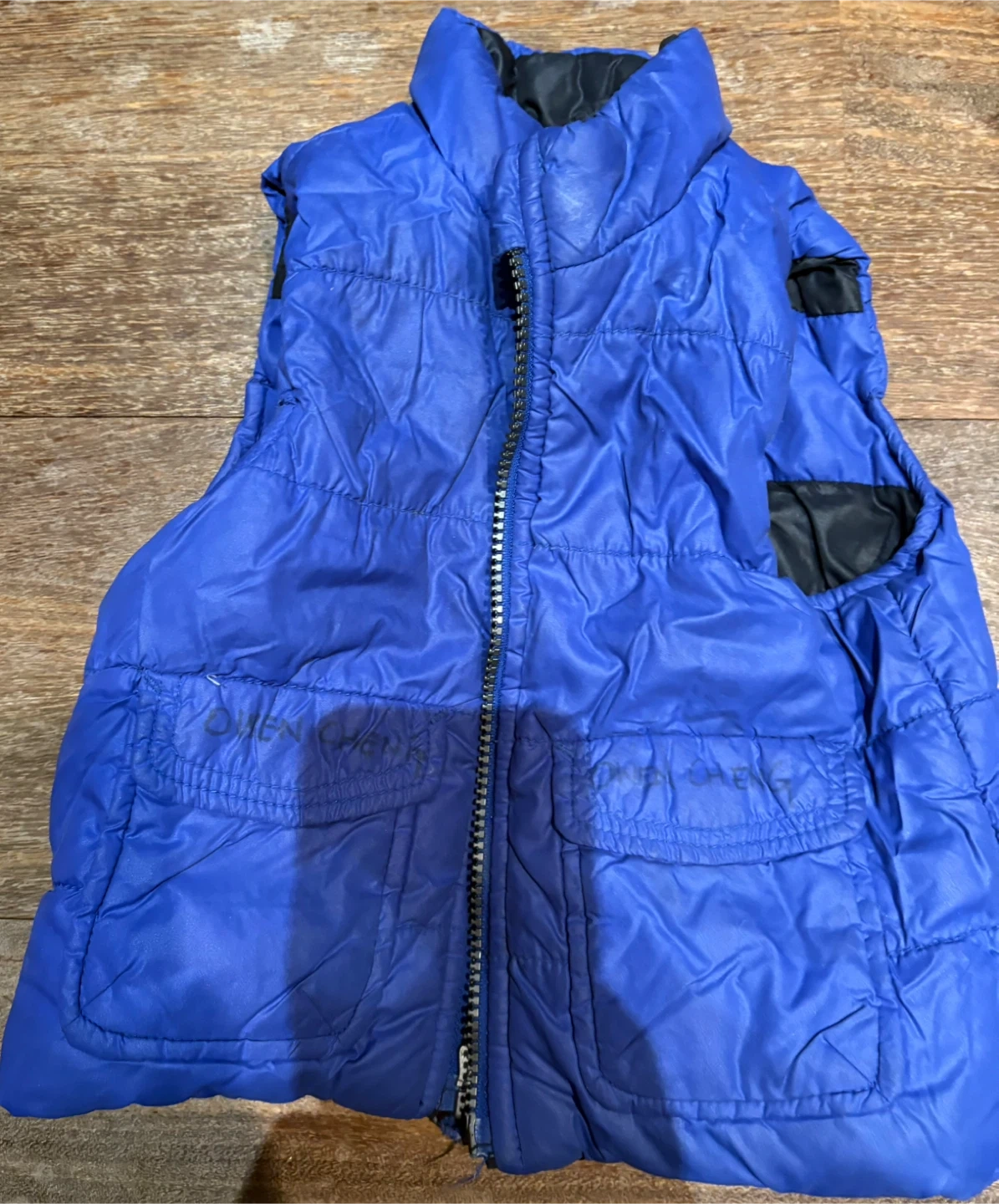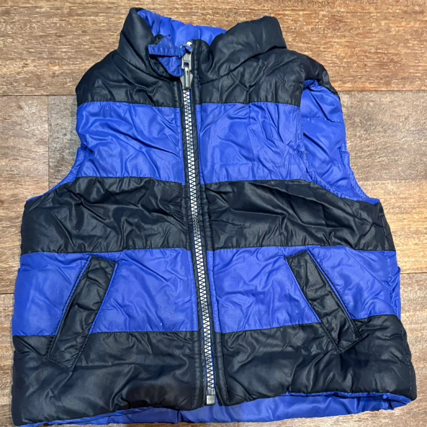 Cozy puffer vest with blue and black stripes. It's got a full zip front and two front pockets. Good for layering on cooler days!