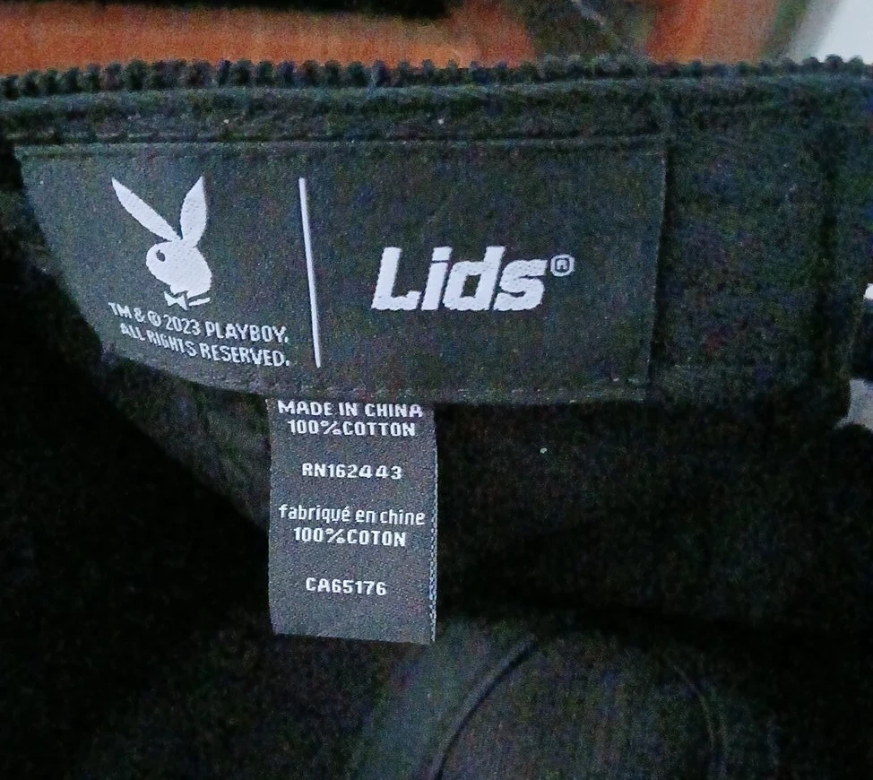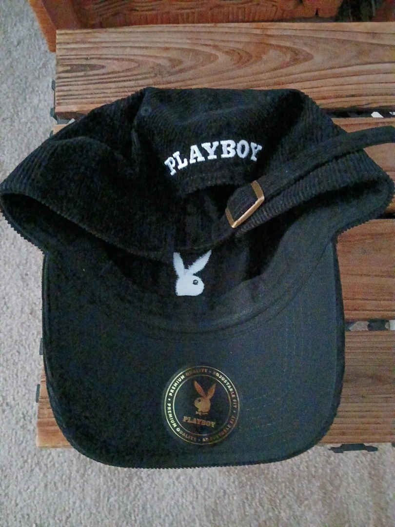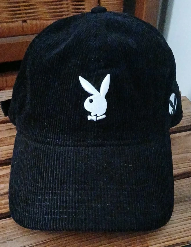 Black corduroy baseball cap with the iconic Playboy bunny logo embroidered on the front. It features a classic adjustable strap for a comfortable fit. Made with 100% cotton.
