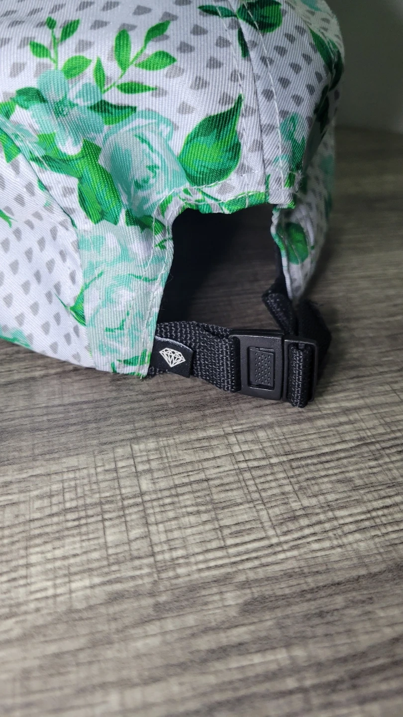 Diamond Supply Co. 5-panel hat with a white and green floral pattern. One size fits most with an adjustable strap. This hat's design offers a fresh look!