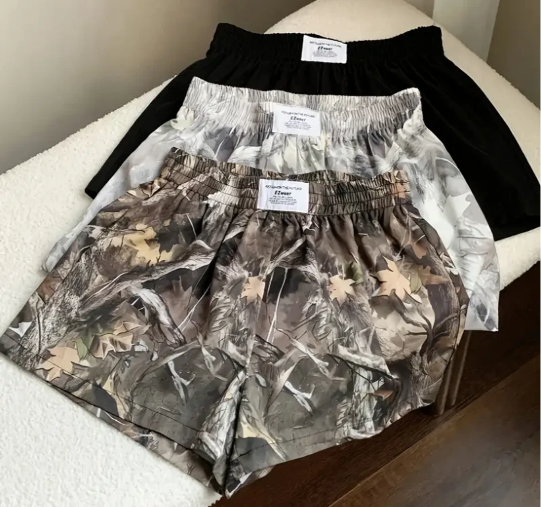 Three pairs of Ezwear shorts. Two feature all-over prints: one in a camouflage pattern and the other in a grey floral design. One pair is solid black. They all have elastic waistbands.