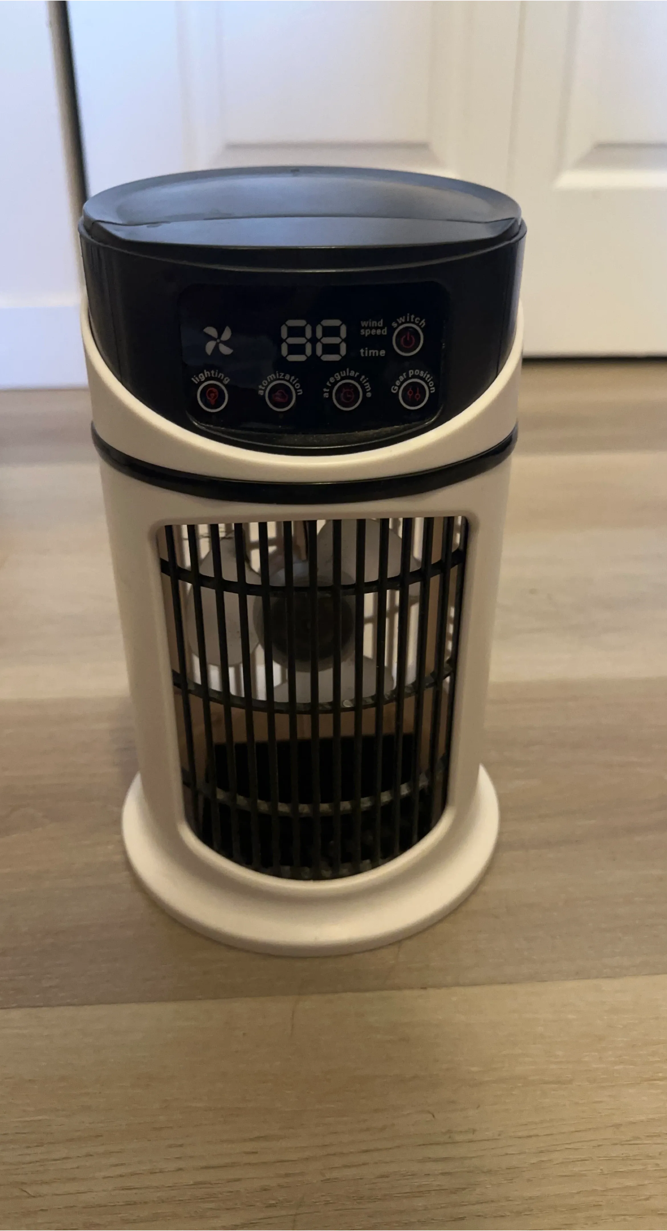 This portable mini tower fan features a digital display with multiple settings including lighting, atomization, regular time, and wind speed. It's a compact solution for personal cooling. The unit is white and black plastic construction.