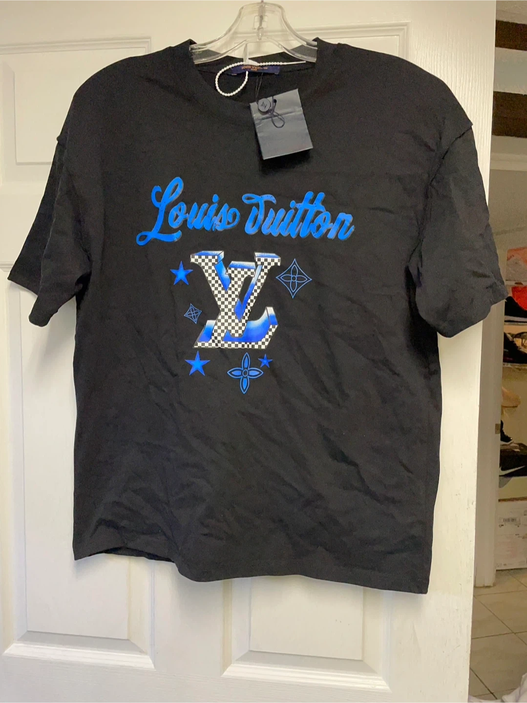 This is a Louis Vuitton t-shirt with a black base and blue accents. It features the Louis Vuitton script logo and a checkerboard LV monogram. Cotton material.