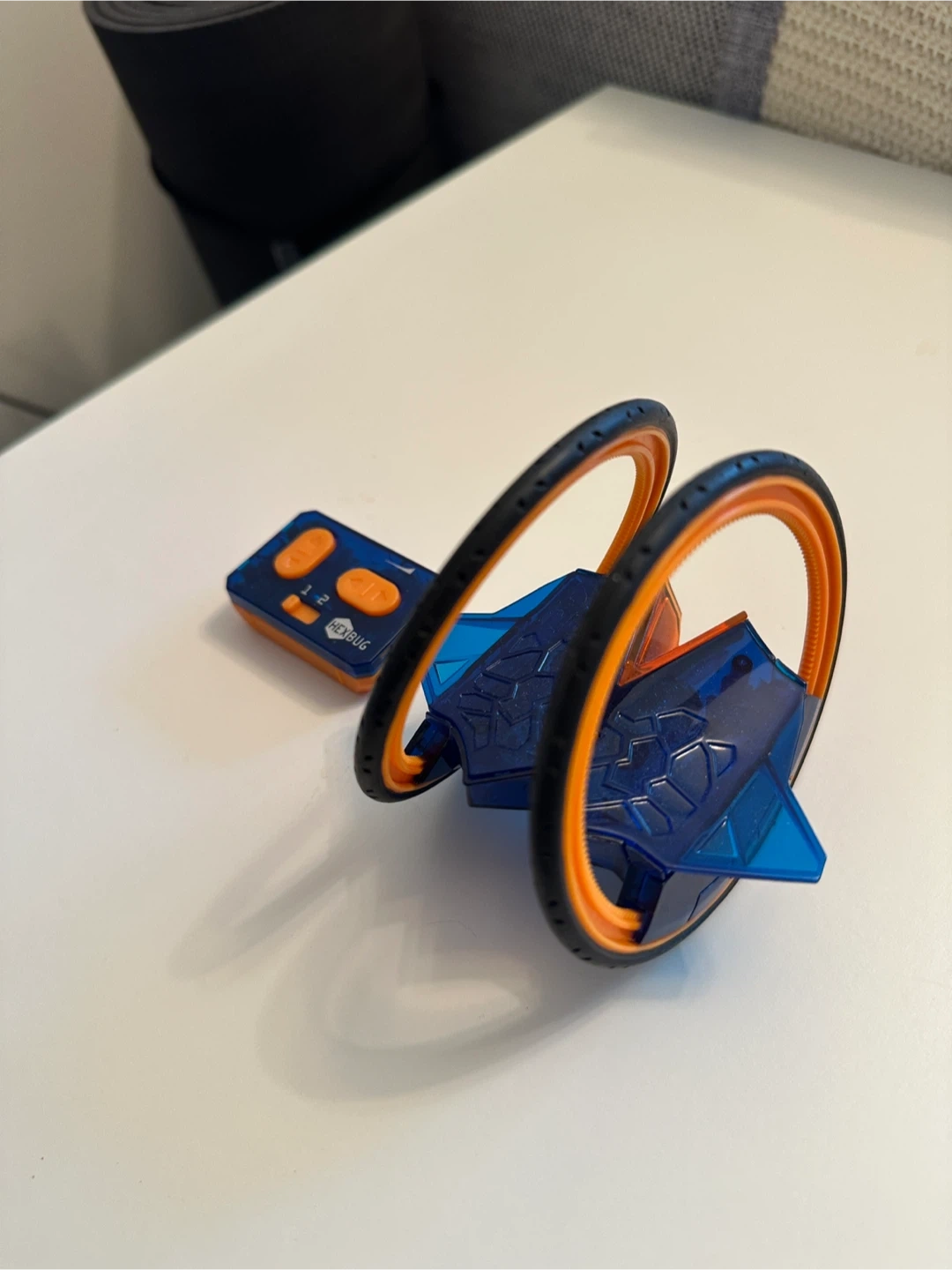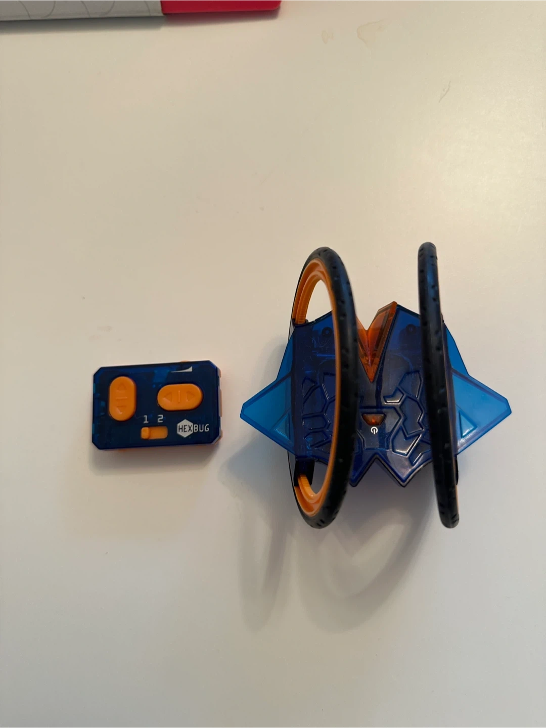 This is a HEXBUG Nano Nitro remote control car. It's a blue and orange translucent buggy with large wheels. Comes with a blue and orange remote control for operation.